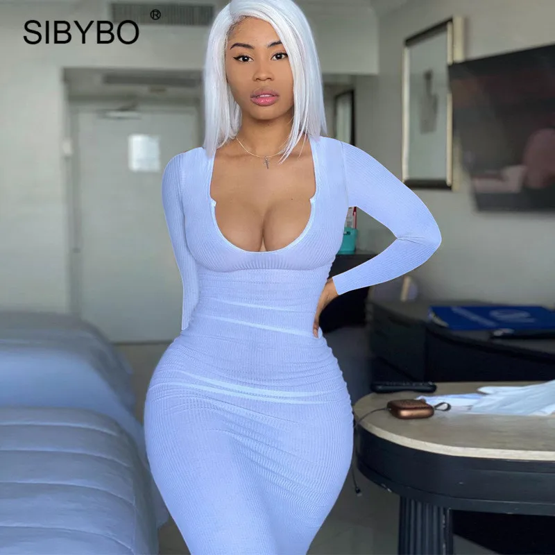 Женское облегающее платье Sibybo, черное облегающее платье с длинным рукавом и v-образным вырезом, лето-осень 2021, Y2K, повседневная одежда для отдыха