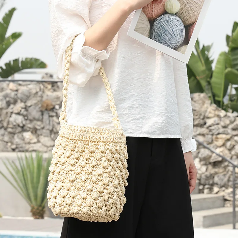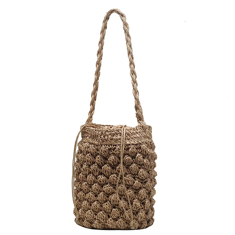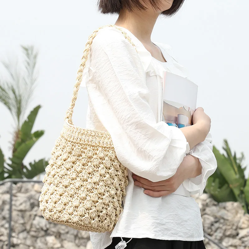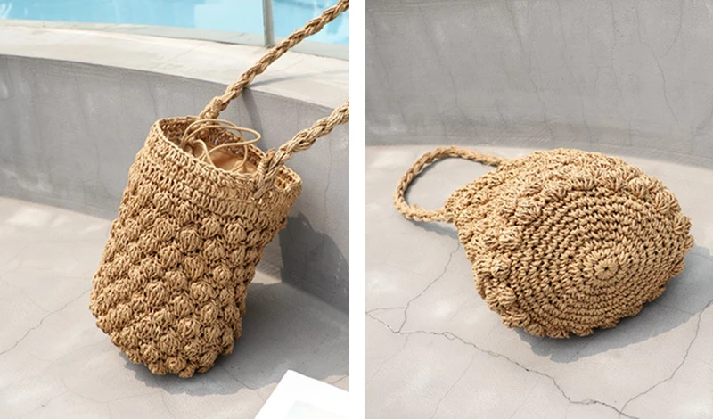 Летняя ручная сумка через плечо для женщин, пляжная сумка через плечо, Плетеная соломенная сумка-ведро с завязками, женская маленькая сумка-тоут