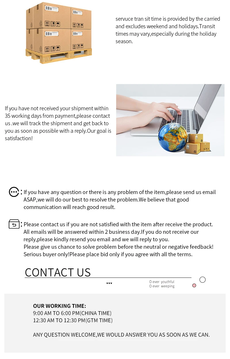 Вопросы и ответы:Вопрос: Как отследить товар?О: вы можете отслеживать по этой ссылке: www.17track.netВ: Как я могу получить оптовую цену?A: Если вам нужна оптовая продажа, пожалуйста, свяжитесь с нами.В: вы принимаете дропшиппинг?A: принимаем дропшиппинг, и мы не будем класть какие-либо счета, qr-коды, акции в пересылке.Так что не волнуйтесь, просто купите его, мы сделаем все возможное для вас. Пожалуйста, свяжитесь с нами, независимо от того, какой вид продукции.