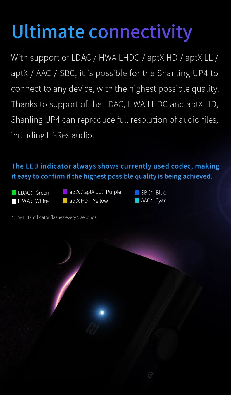 Shanling UP4 новейший в мире Bluetooth беспроводной DAC/усилители, поддерживает все текущие беспроводные аудио кодеки-такие как AAC, SBC, aptX, aptX низкая задержка, aptX HD, LDAC, LHDC и HWA, включая Hi-Res аудио. Возможно подключение к любому устройству с максимально высоким качеством. Эта прочная поддержка формата обеспечит отличное качество звука, чтобы дать вашим наушникам новую жизнь, и позволит им еще раз резонировать с вами эмоционально.
