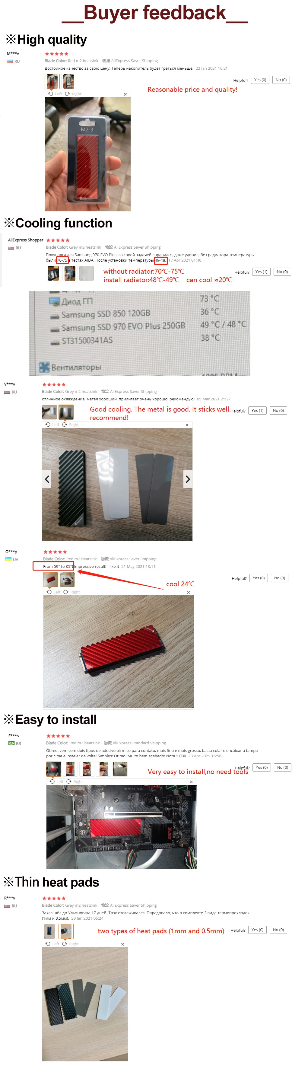 Особенности:1. Всесезонная пескоструйная обработка из алюминия и анода, с наклонной ветровой направляющей на 45 °, более подходит для воздуховода шасси, быстро снимает тепло SSD, мини-размер обеспечивает лучшую совместимость2. Теплоотвод из алюминия с встроенной теплопроводящей силиконовой прокладкой, которая быстро проводит тепло и позволяет избежать перегрева и замедления работы SSD.3. Поверхность обработана анодной пескоструйной обработкой, чтобы предотвратить коррозию и ржавчину, и ее нелегко загрязнить.4. Не только верх может рассеивать тепло, но полоска внизу может также рассеивать тепло, что может быстро отнять тепло.