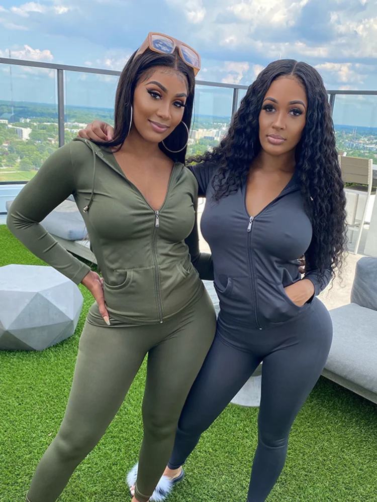 Комплект из двух предметов, Женский свитшот с длинным рукавом и карманами на молнии, спортивные комплекты, облегающий клубный комплект из двух предметов, женский спортивный костюм