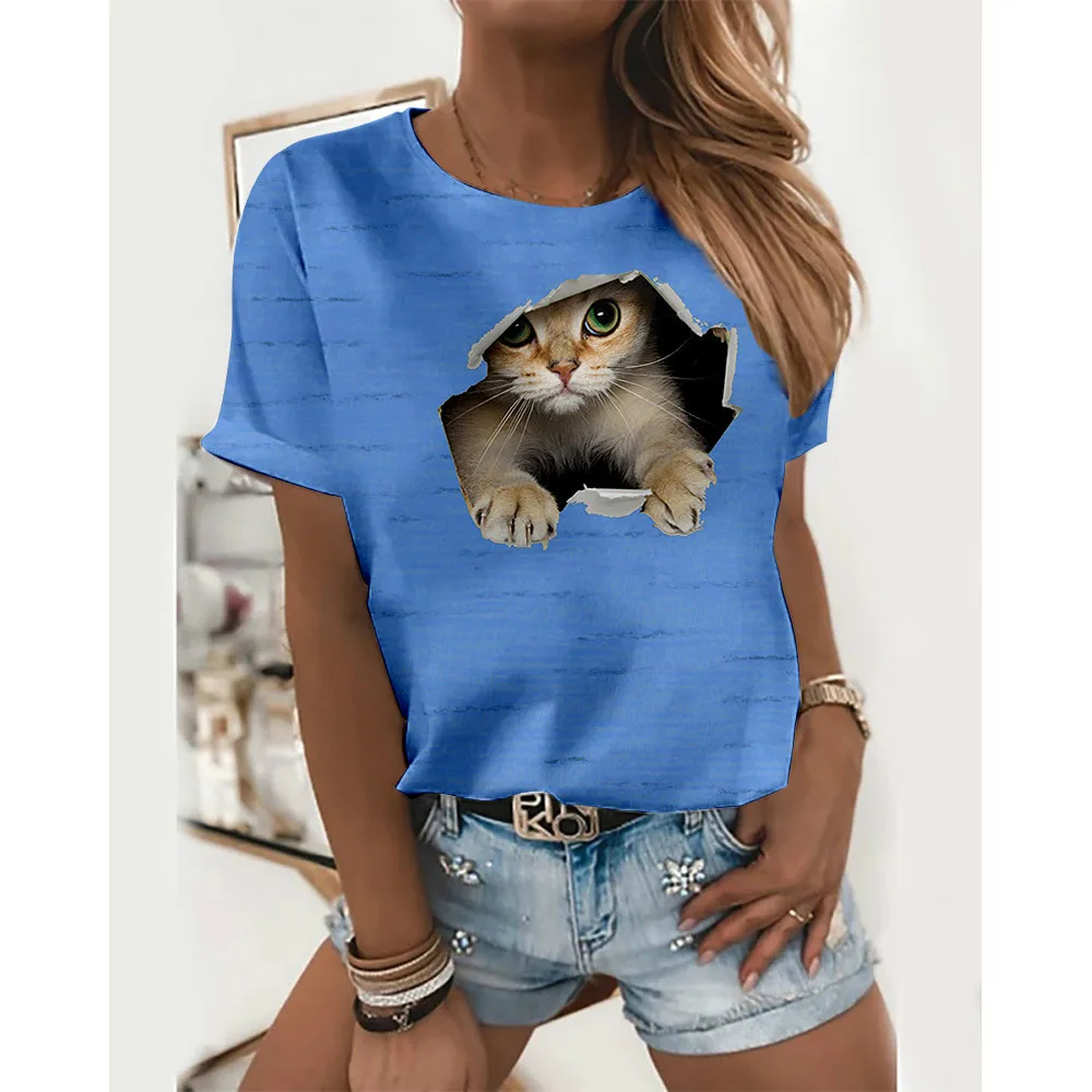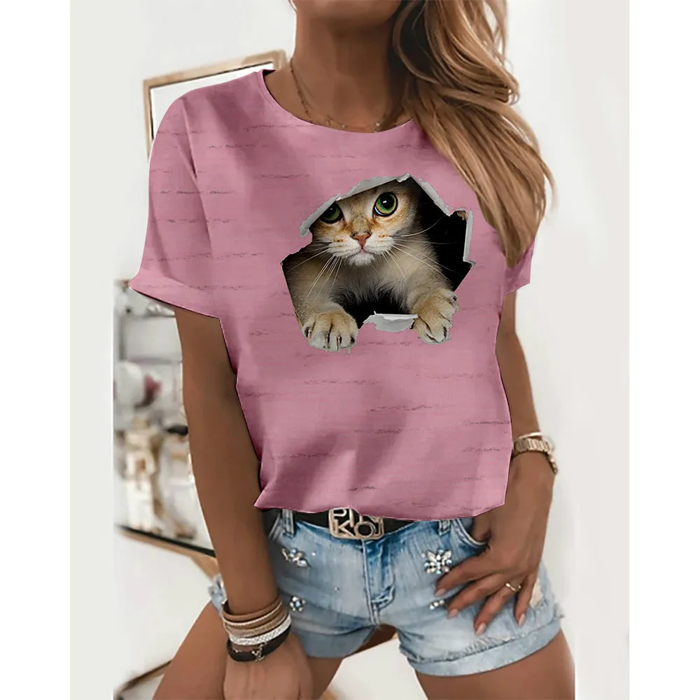 Женская футболка с 3D принтом кошки и круглым вырезом, Повседневная футболка из полиэстера с короткими рукавами и узором в виде кота, лето 2021