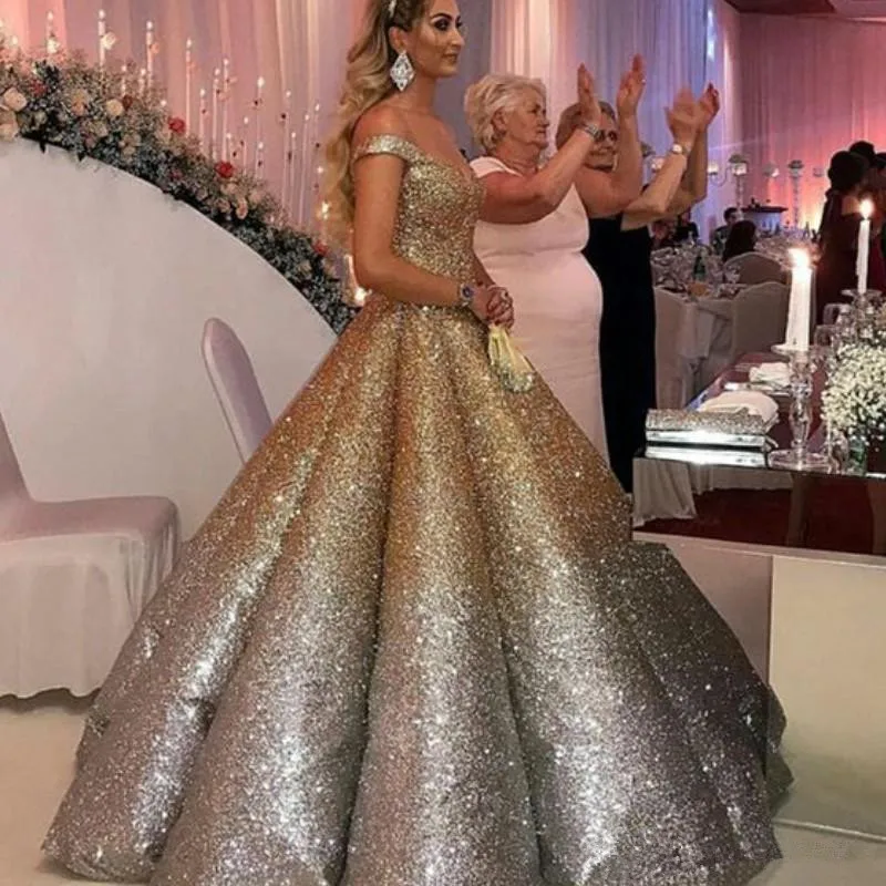 Блестящие золотистые и Серебристые вечерние платья 2021, пышная юбка с открытыми плечами, Арабский кафтан, бальное платье, платье для выпускного вечера