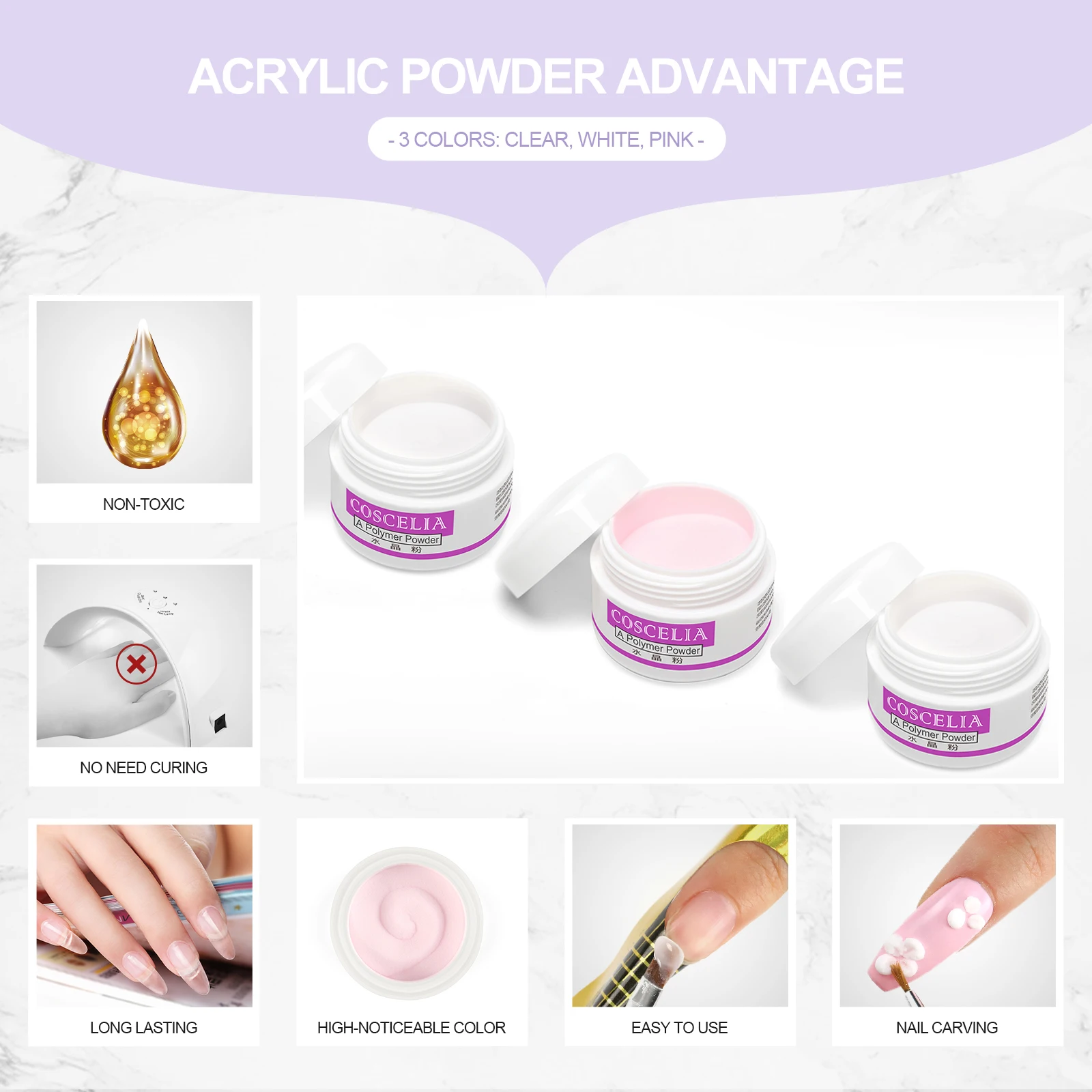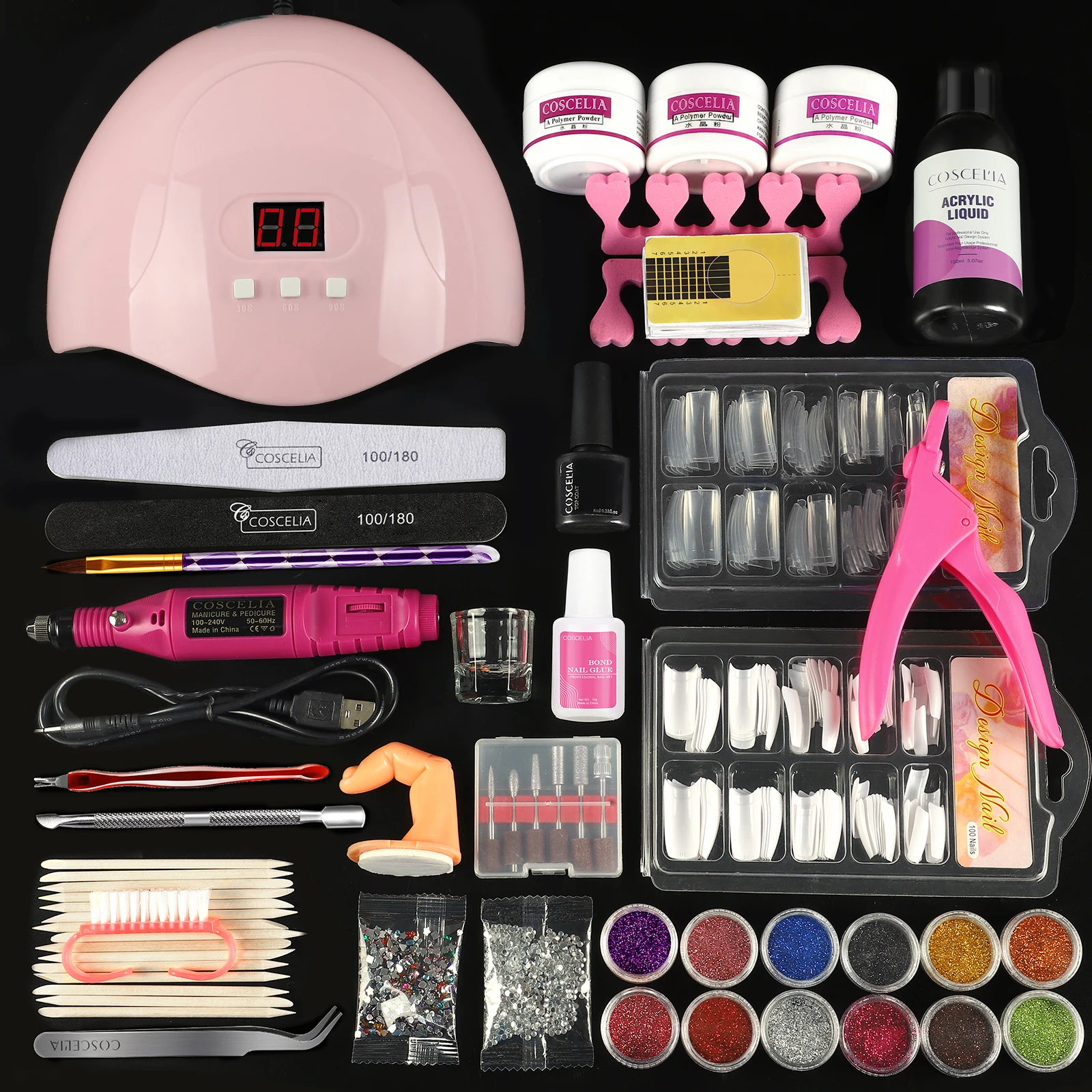 Набор акриловых порошков COSCELIA, лампа для сушки ногтей, сверло для ногтей, блеск, все для маникюра, инструменты, щетка, профессиональный набор для ногтей, ногти