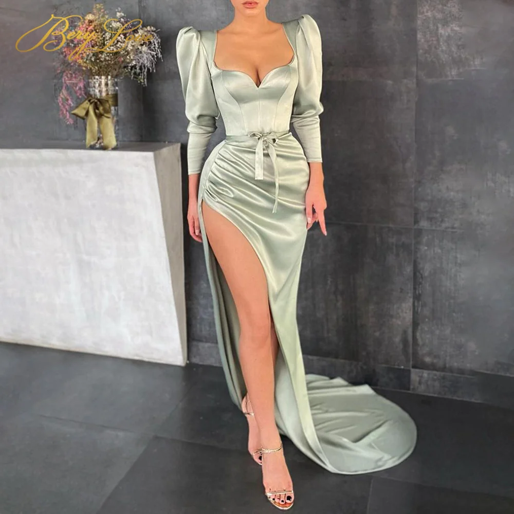 Длинные атласные вечерние платья Berylove с рукавом Бишоп, соблазнительное Мятное вечернее платье с разрезом сбоку, элегантное вечернее платье с бантом на поясе, вечернее платье