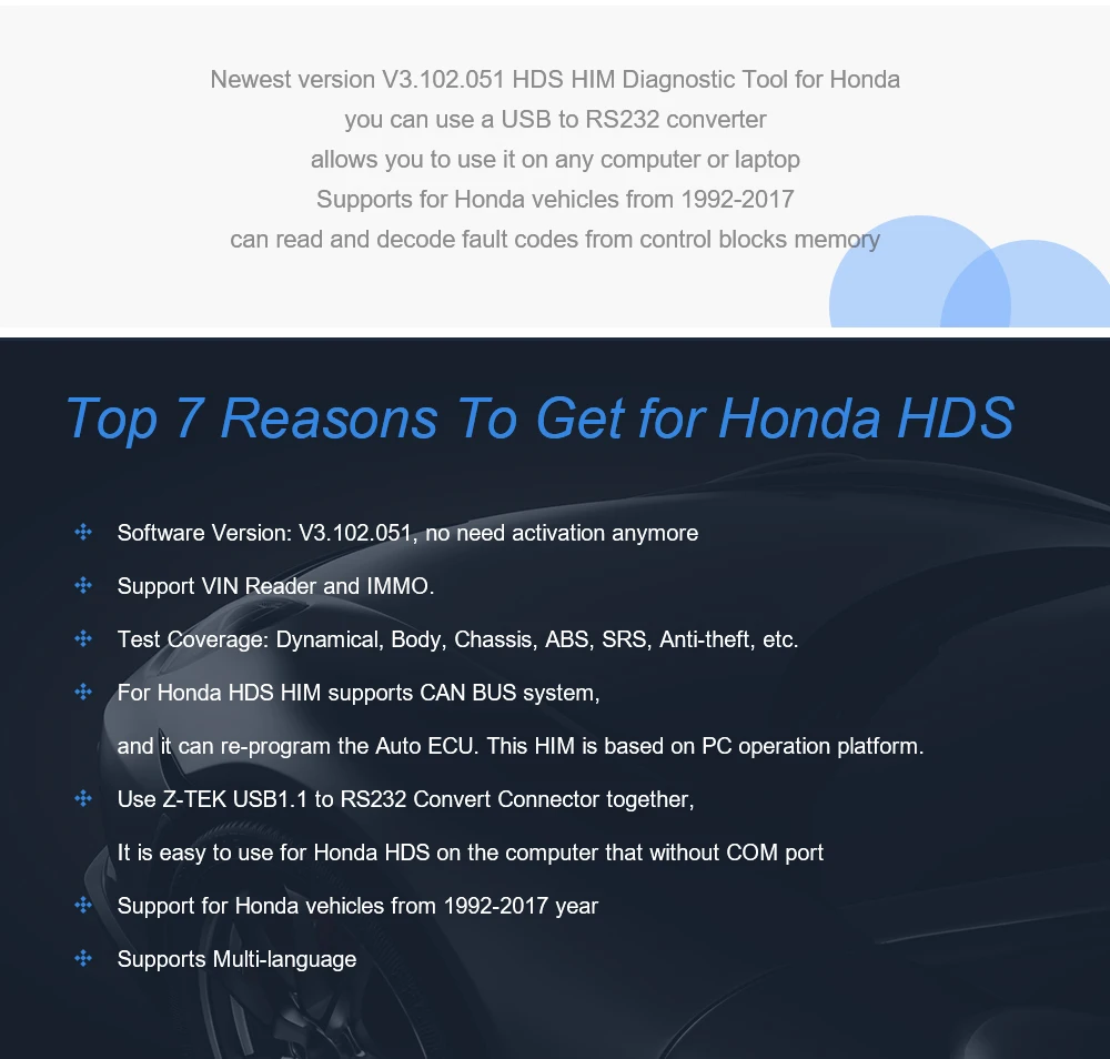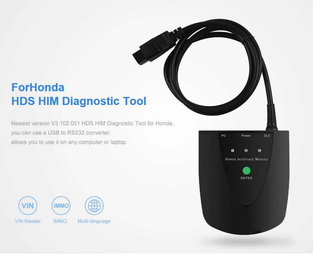 Новейшая версия V3.103.066 HDS HIM диагностический инструмент для Honda, поставляется с USB в RS232 конвертер, позволяет использовать его на любом компьютере или ноутбуке. Поддерживает автомобили Honda с 1992 по 2017 год, может считывать и декодировать коды неисправностей из памяти блоков управления.