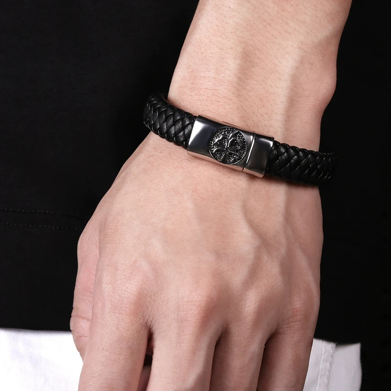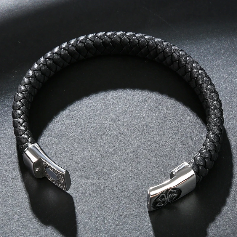 Плетеный кожаный браслет P076 для мужчин, ювелирное изделие ручного изготовления в стиле панк, браслет из нержавеющей стали с изображением четырехлистного клевера, P076