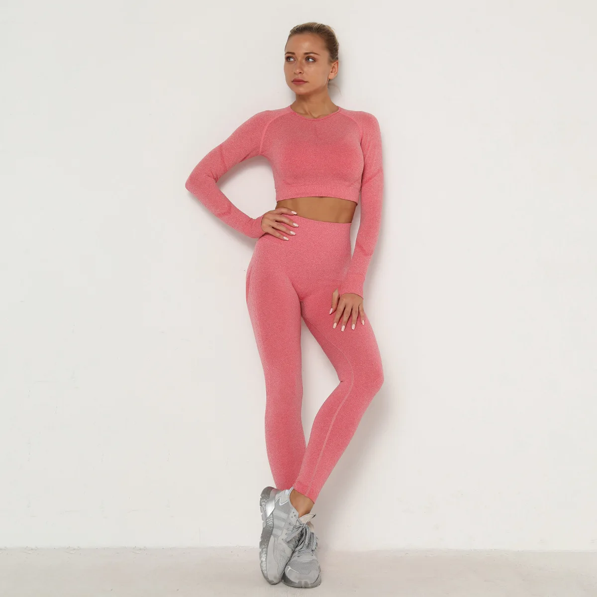 Бесшовная Женская одежда, спортивный комплект для тренажерного зала, Топ с длинным рукавом, леггинсы с высокой талией для контроля живота, сексуальный костюм, пластиковые штаны
