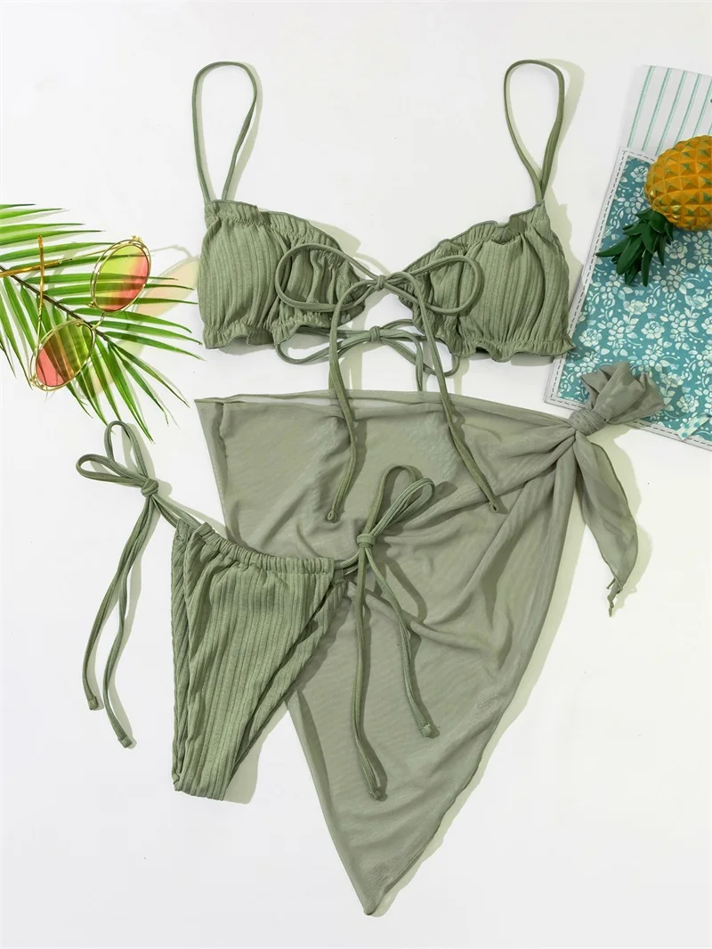 Комплект бикини COOBBU из 3 предметов, женский купальник, сексуальное бикини, Женский бандажный однотонный купальник, пляжная одежда для купания
