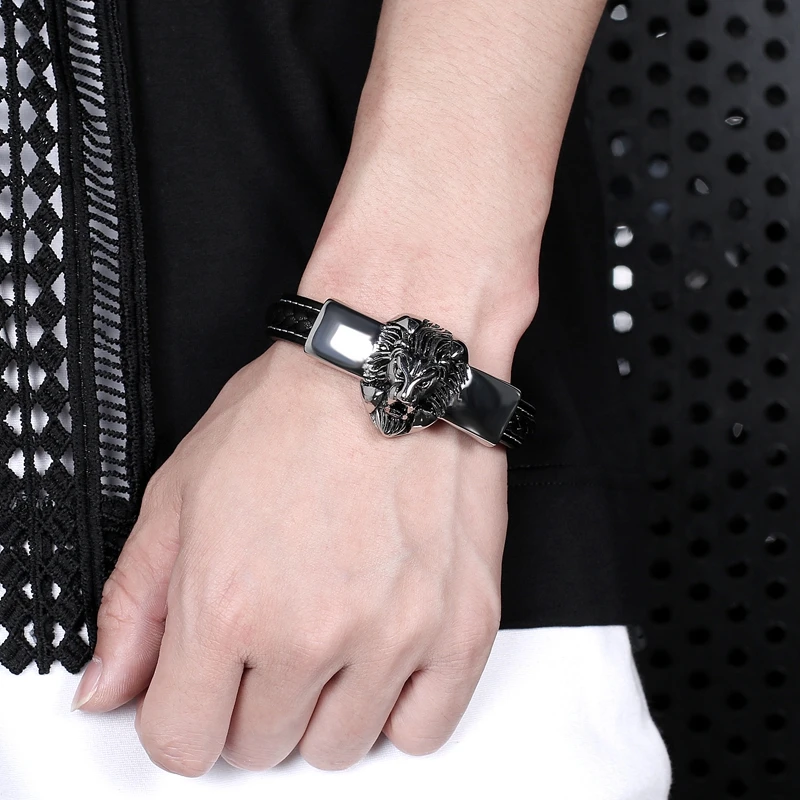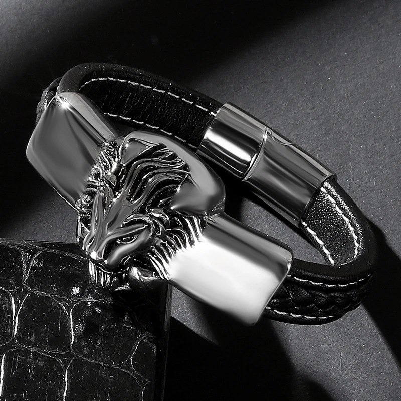 Модный плетеный кожаный браслет для мужчин, ювелирные изделия ручной работы для вечеринки, браслеты из нержавеющей стали с головой льва в стиле панк, мужской браслет для мальчиков, подарок P060