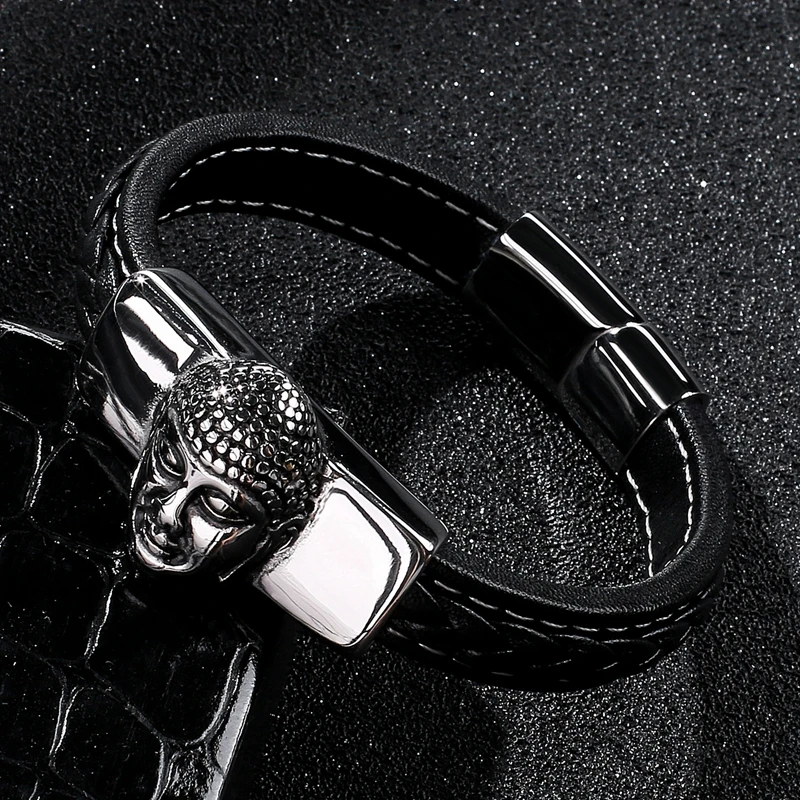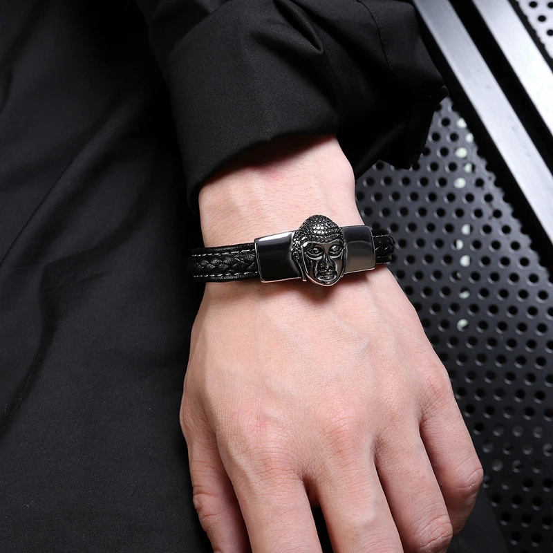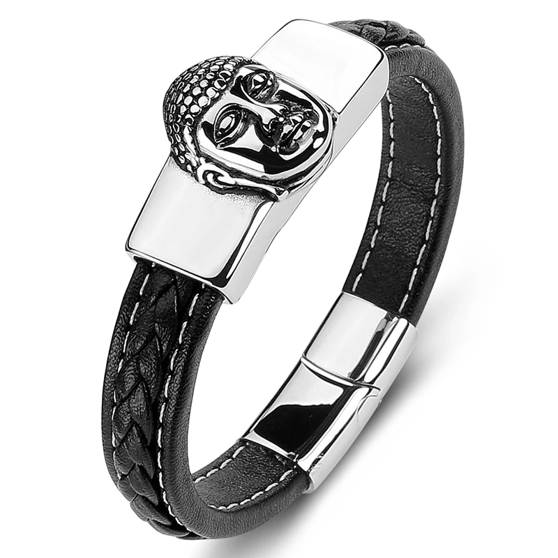 Модный плетеный кожаный браслет, Мужские Винтажные Ювелирные изделия ручной работы в стиле панк, браслеты из нержавеющей стали Будды религии, мужской браслет P059
