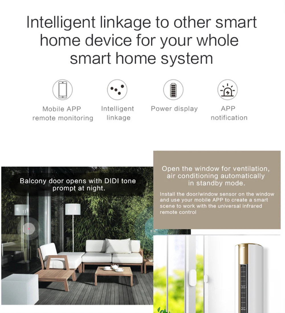 Вы можете установить умную сцену в приложении. Например: когда датчик двери/окна открывается/закрывается, ИК откроет/закроет кондиционер. Вам никогда не придется беспокоиться о том, что вы забыли выключить кондиционер.