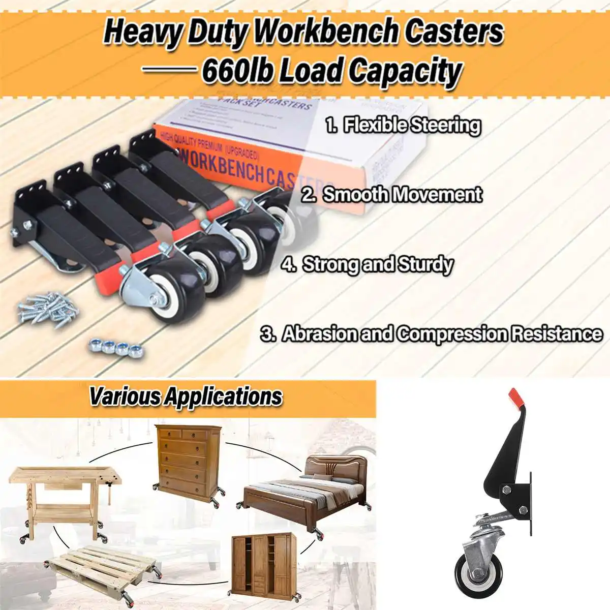 4. Сверхпрочные Колесные Ролики изготовлены из прочной стали и уретановых колес, которые могут плавно двигаться на 360 градусов. Износостойкие уретановые колеса более устойчивы к тяжелым скамейкам. Подходит для широкого ежедневного использования, например workbe.
