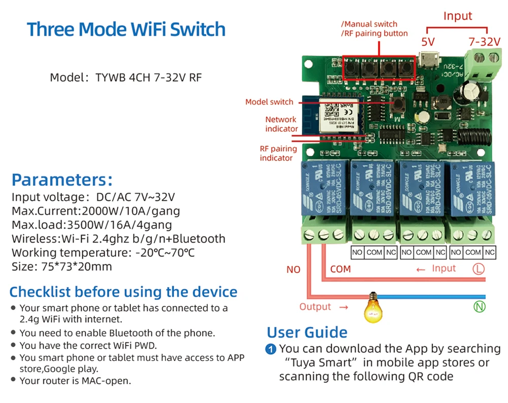 * Входное напряжение: Постоянный/переменный ток 7-32 В, вход Micro USB 5 В.* Максимальный ток: 220 Вт/10 А.* Стандарт Wi-Fi: Wi-Fi 2,4 ГГц b/n/g.* Размер: 1CH 69*41*20 мм, 2CH 10*35*20 мм, 4CH 78*74*20 мм.* Срок службы модели реле более 1000, 00.* Функция подключения по умолчанию: нажмите на открытое реле на мобильный телефон, затем автоматически отключите тягу, вы можете установить время подключения в приложении, он имеет функцию синхронизации одновременно.* Самоблокировка при нажатии кнопки подключения и блокировки при включенном светильник. Нажмите «открыть реле», чтобы натянуть, нажмите «закрыть реле», чтобы отключить.