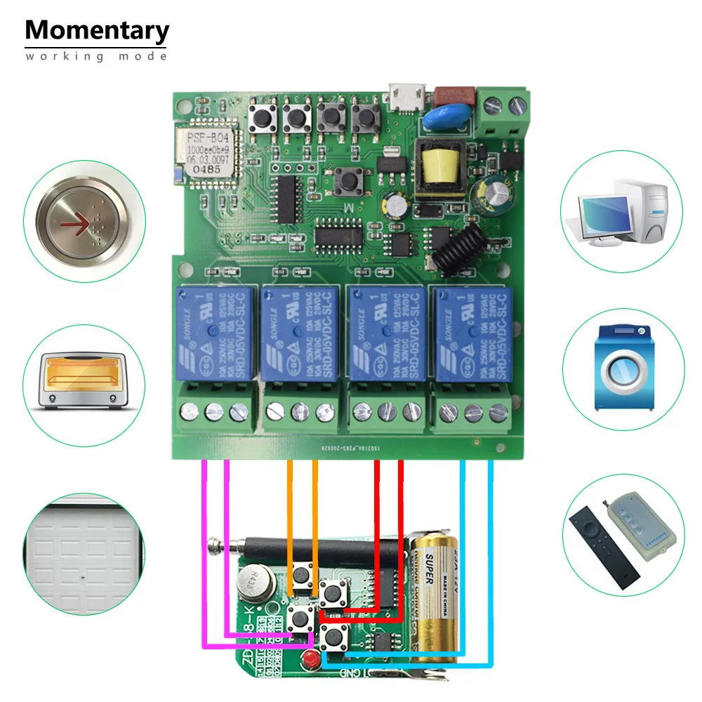* Этот беспроводной переключатель поддерживает режим подключения/самоблокировки.* Пользователи могут добавить устройство в приложение Smart life для удаленного управления подключенной бытовой техникой или устройствами.* В режиме самоблокировки клиенты могут сразу удаленно включать/выключать подключенные устройства.* В режиме подключения клиенты могут выбрать два способа подключения, и вы можете установить время подключения в приложении.* Модель управления Wi-Fi, программировать не нужно. Независимо от того, где вы находитесь, вам нужно только загрузить приложение, чтобы подключить Wi-Fi и управлять облаком.* Режим RF, вы можете управлять платой с помощью пульта дистанционного управления RF433.