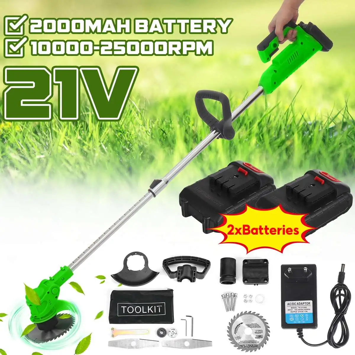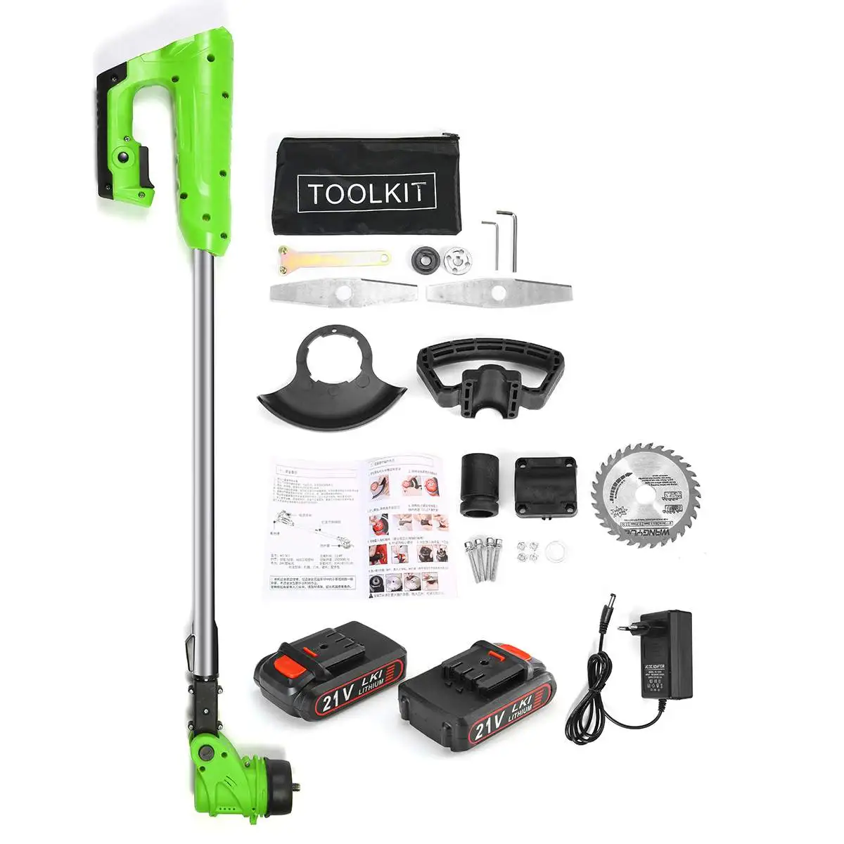 Посылка включает в себя:1 x триммер для травы1 x вспомогательная ручка2 батарейки1 x циркулярная пила1 х стальная проволока3 х гаечный ключ2 x стальное лезвие4 x Пластиковые лезвия1 х адаптер1 x коробка