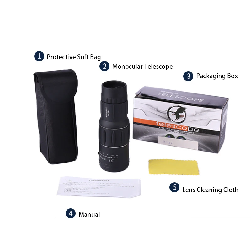 Примечание: не смотрите прямо на солнце через телескоп, иначе это повредит ваши глаза.Посылка включает в себя:1 Монокуляр1 сумка для переноски1 х Ткань для объектива1 Руководство пользователя