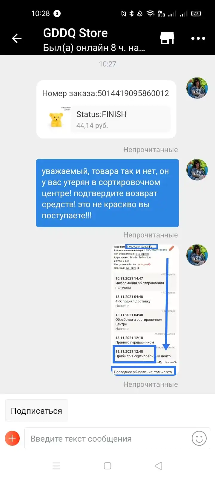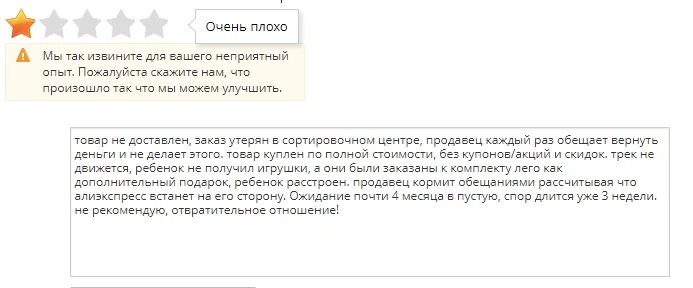 товар не доставлен, заказ утерян в сортировочном центре, продавец каждый раз обещает вернуть деньги и не делает этого. товар куплен по полной стоимости, без купонов/акций и скидок. трек не движется, ребенок не получил игрушки, а они были заказаны к комплекту лего как дополнительный подарок, ребенок расстроен. продавец кормит обещаниями рассчитывая что алиэкспресс встанет на его сторону. Ожидание почти 4 месяца в пустую, спор длится уже 3 недели. не рекомендую, отвратительное отношение!