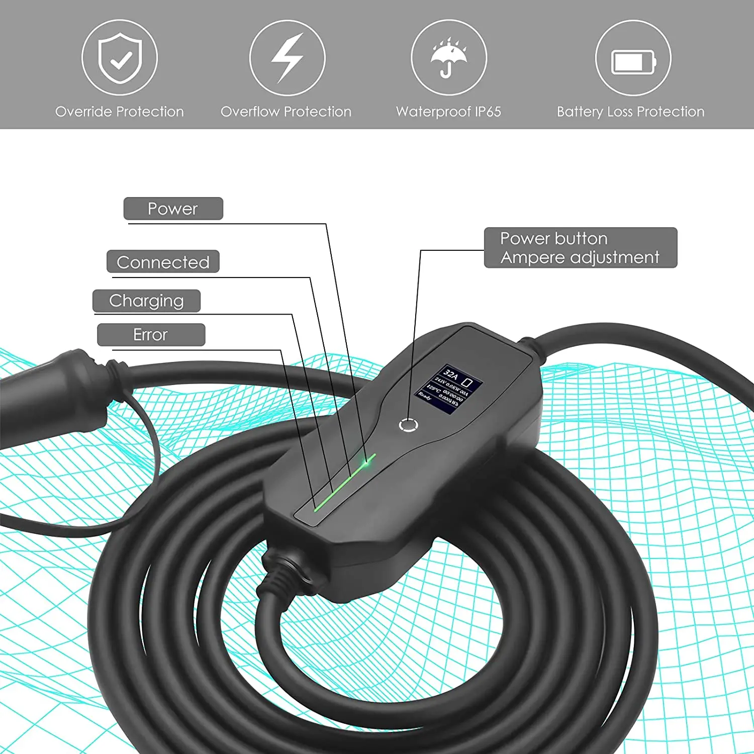 【Быстрая зарядка speed】 наш уровень 2 8/12/16/20/24/32 A, зарядное устройство EV может заряжать ваш автомобиль быстрее, чем другой уровень 1. Ток в зарядном ящике может свободно переключаться между 8/12/16/20/24/32 A для удовлетворения всех ваших потребностей. Электрический цифровой экран может отражать все состояние, которое вы хотите. Примечание: ток не может быть переключен во время зарядки