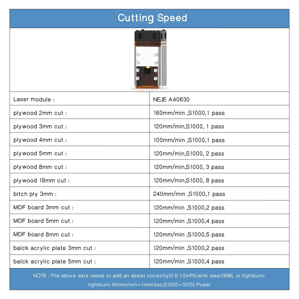 -Предназначен для лазерного гравера, 3D принтера, CNC мельницы, arduino проекта.-7,5 Вт оптический выходной мощности, 4 мм фанера от 1 проход (скорость 100),-Более безопасное, встроенное Защитное стекло для защиты глаз! Даже не надев защитные очки, операция более комфортная.-Более тихий, умный привод регулирует скорость охлаждающего вентилятора в соответствии с лазерной температурой.-Простой в использовании, цифровой ШИМ Генератор импульсных сигналов с регулируемой частотой рабочего цикла для neje лазерного модуля.-Для легкой регулировки фокуса предусмотрена скользящая крепежная арматура.30 Вт Общая Спецификация:Модель: NEJE Module 30WМатериал радиатора: авиационный алюминий + латунный корпусСветящийся цвет: синийРазмер сечения: 40 мм x 40 ммРежим охлаждения: Интеллектуальный контроль датчика температуры + вентилятор охлаждения 10000 об/мин 40 ммРазмер: 60*40*40 ммРазъем адаптера: 5,5 2,1 портГравировка: МДФ/балса/бумага/дерево/ткань/пластик/кожа/Фанера/пенная бумага/анодированный алюминийНе выгравировать: металл/стекло/камень/керамика/PCB/нержавеющая сталь/светоотражающий материал/прозрачный материалТехнические параметры:Вход модуля: 20-30 ВтОптическая Выходная мощность: 7,5 Вт (7500 МВт)Длина волны: 455-450нмФорма луча: точка (фокусируемая)Рабочее напряжение: 12 В постоянного токаМодуляция TTL и PWM: Да, Совместимость с модуляцией TTL и PWMВходное напряжение: DC12V 3APWM/TTL Вход: DC3.3V-12VВходной интерфейс: PH2.0-4Pin (+,-, ШИМ/TTL, температура), 3Pin (+,-, ШИМ/TTL) , 2Pin + 2Pin (+,-) + (ШИМ/TTL,-)Примечание: Температурный интерфейс может быть отключен, NEJE предоставляет текстовые инструкции по приобретению температуры на wiki.Режим привода: внешний ACCБезопасный диапазон температур:<60 ℃Вес модуля: 202 г (чем легче вес, тем меньше инерция движения, тем лучше производительность)Срок службы: 10000-20000 часов