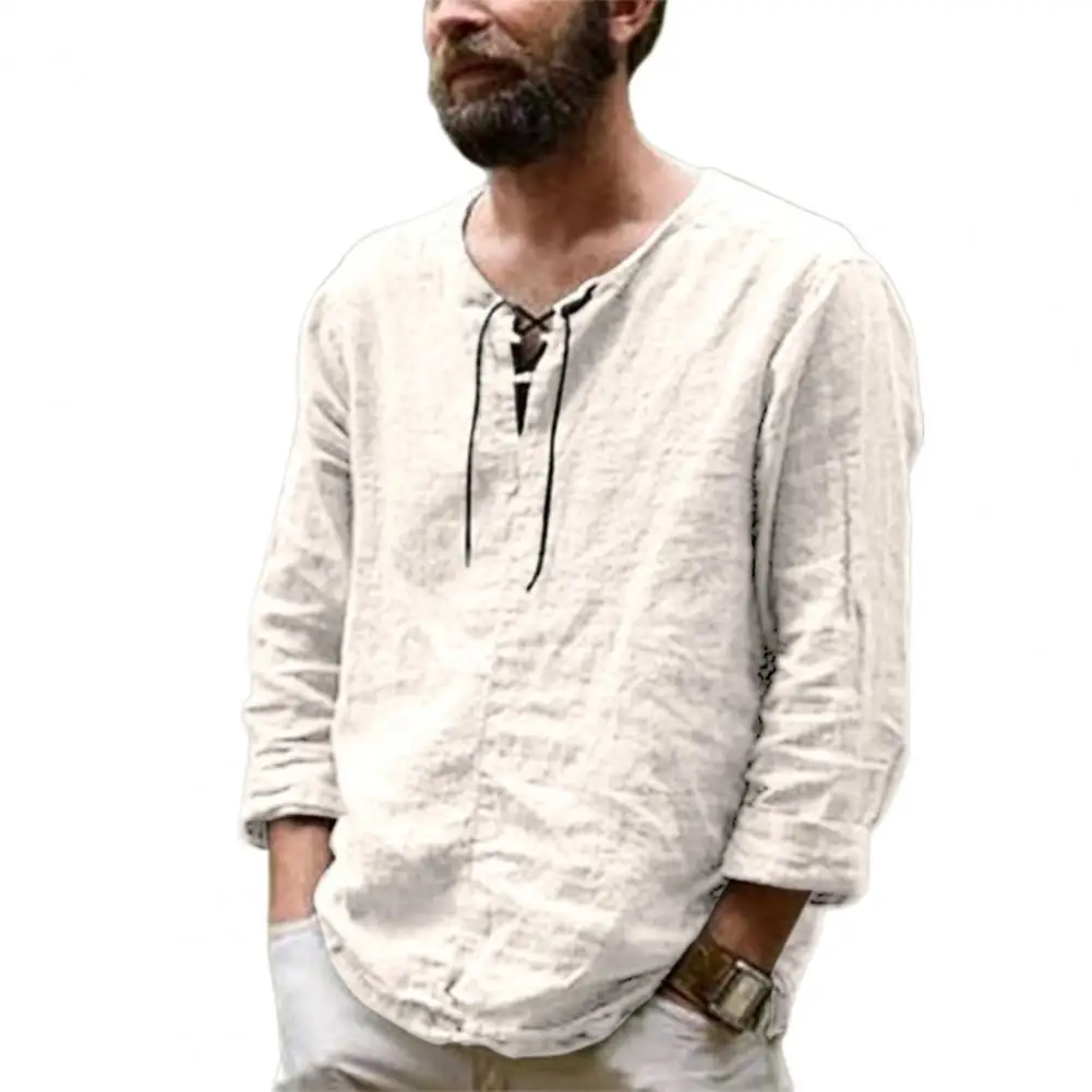 Мужская льняная рубашка в стиле хиппи, повседневный пляжный Свободный Топ со шнуровкой и средним рукавом, Однотонная футболка с V-образным вырезом на лето