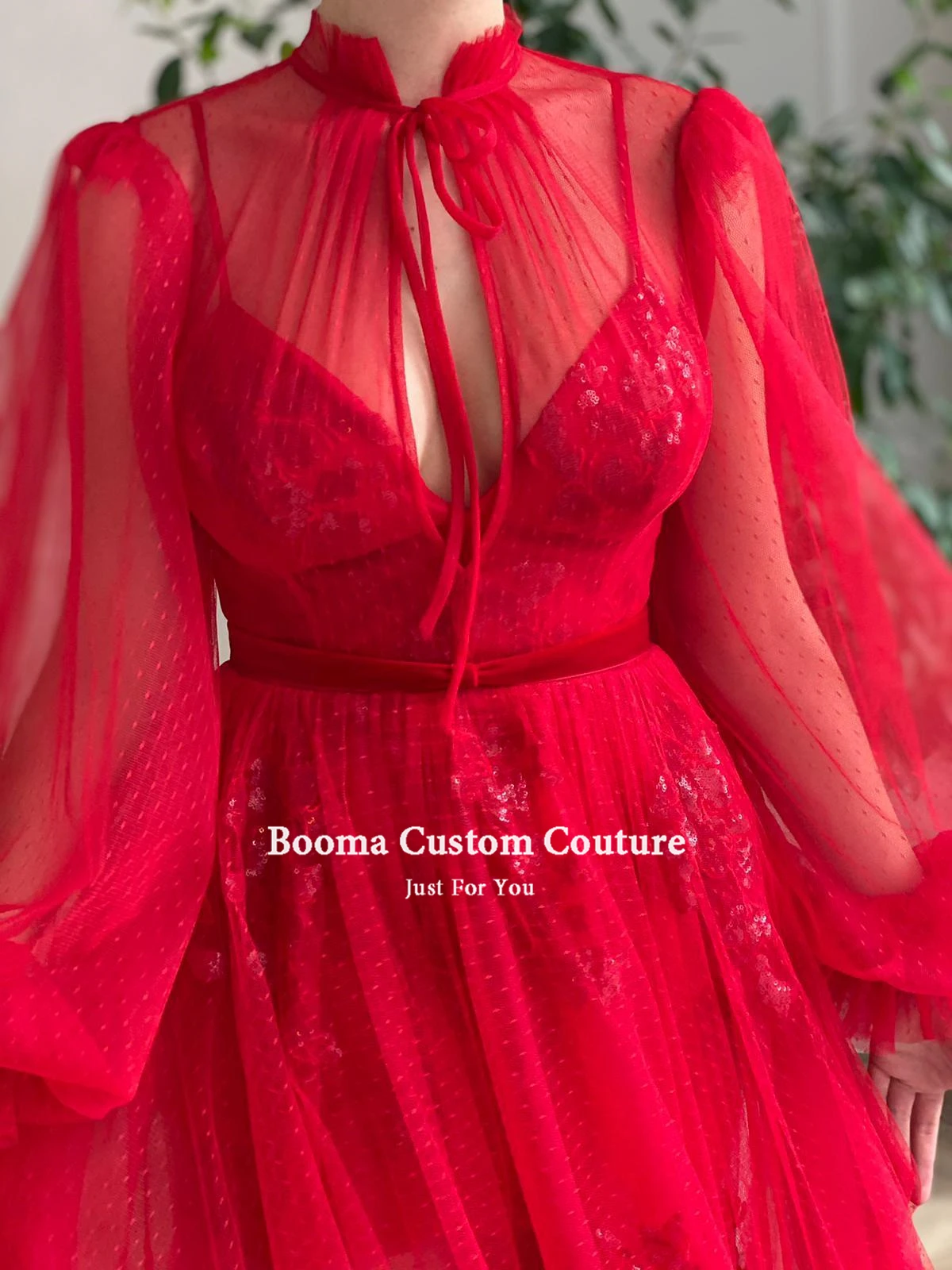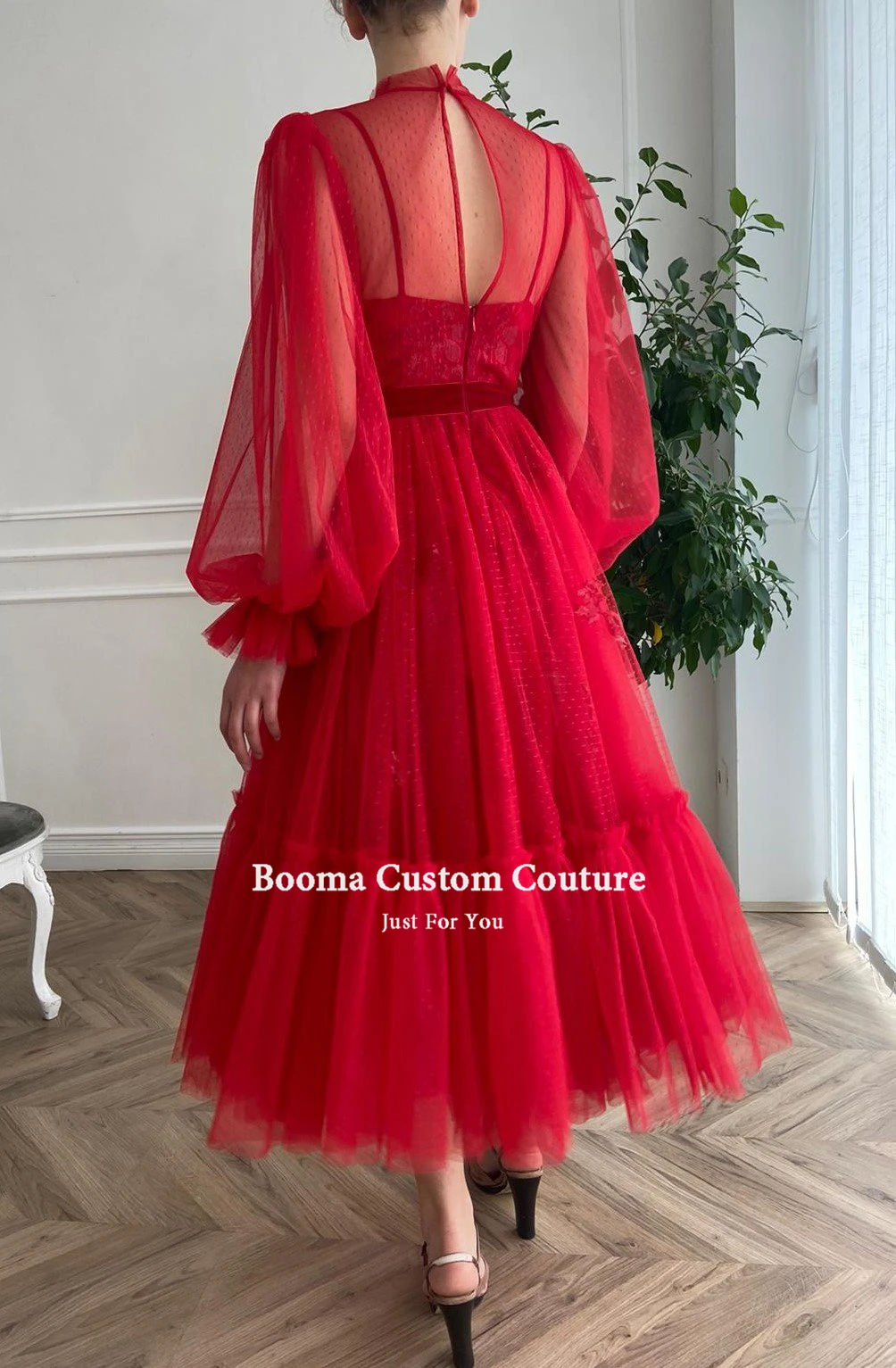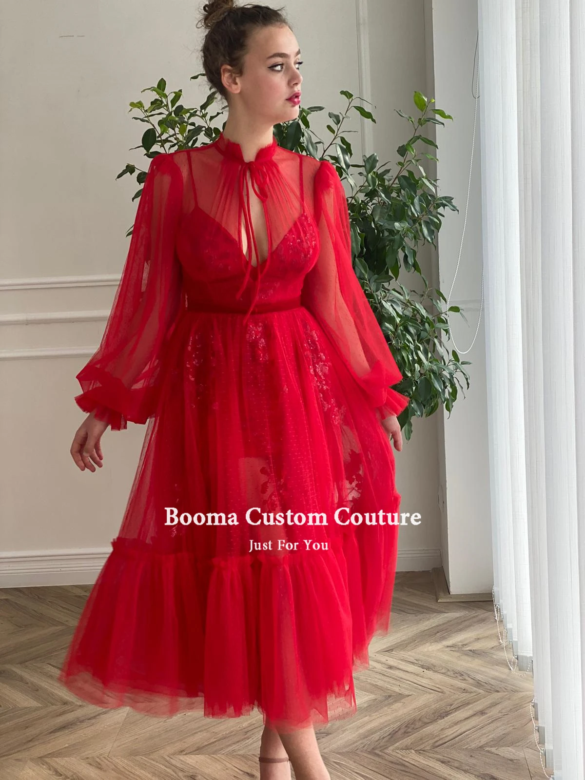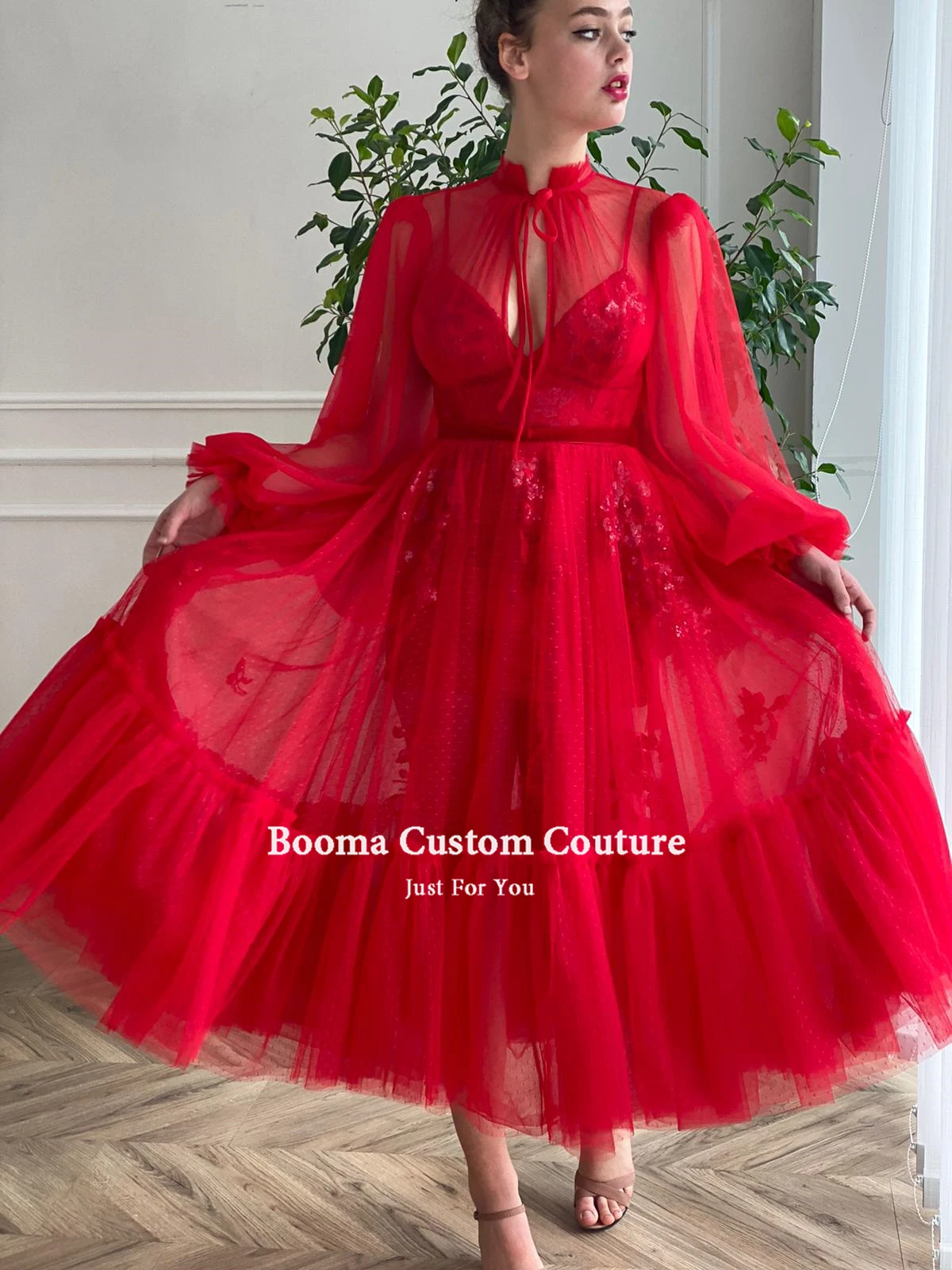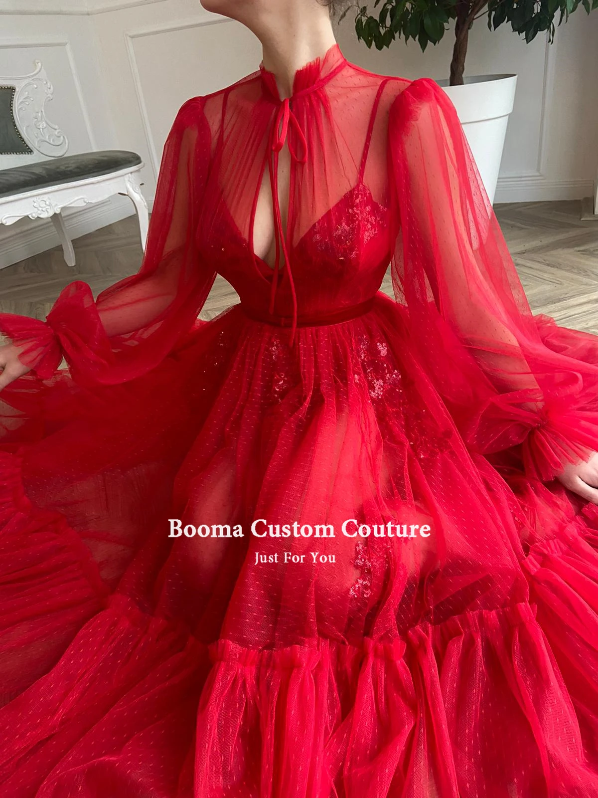 Booma красного цвета в горошек с фатиновой юбкой-миди платья для выпускного вечера с манжетами одежда с длинным рукавом с пайетками аппликации Чай-Длина ТРАПЕЦИЕВИДНОЕ платье для выпускного бала, нарядные платья для свадьбы