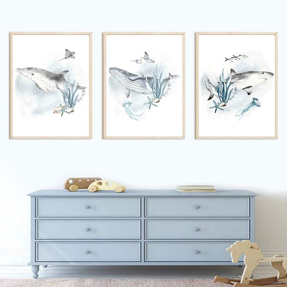 Акварель Морская жизнь кит дельфин детский Северный плакаты и принт...
