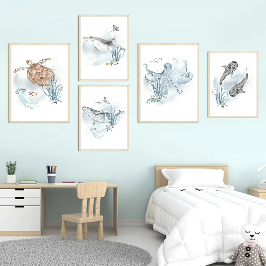 Акварельный дельфин, осьминог, морская жизнь, скандинавские плакаты...