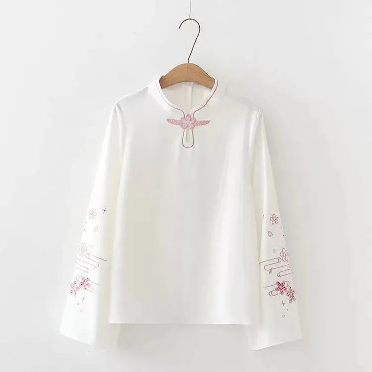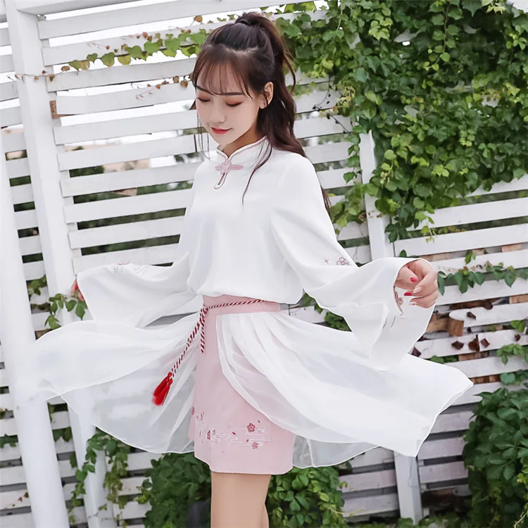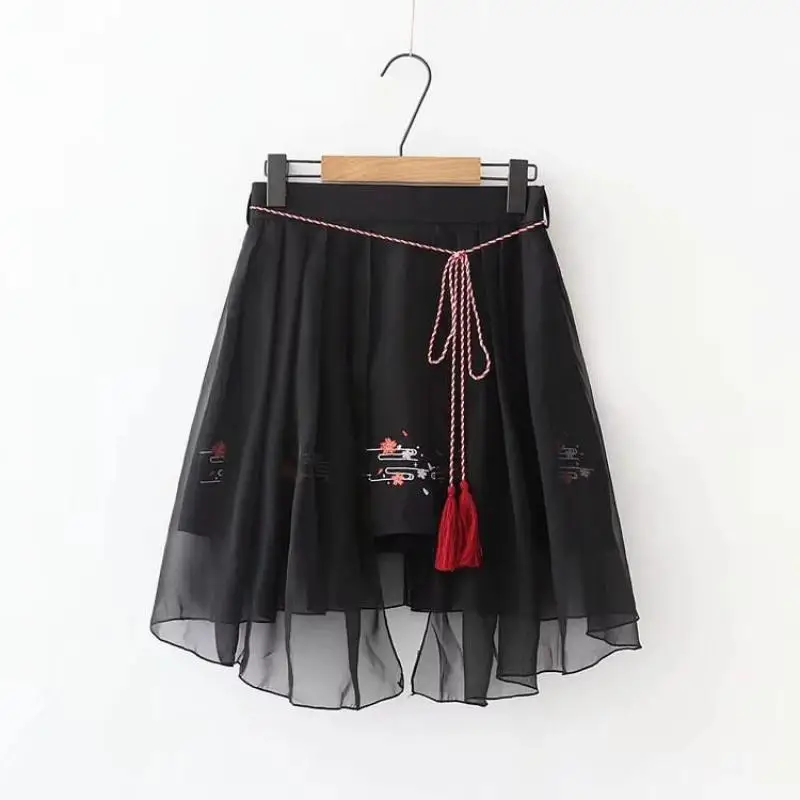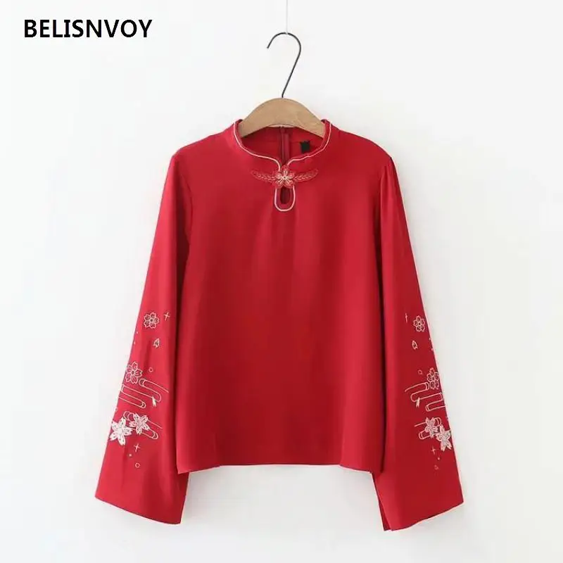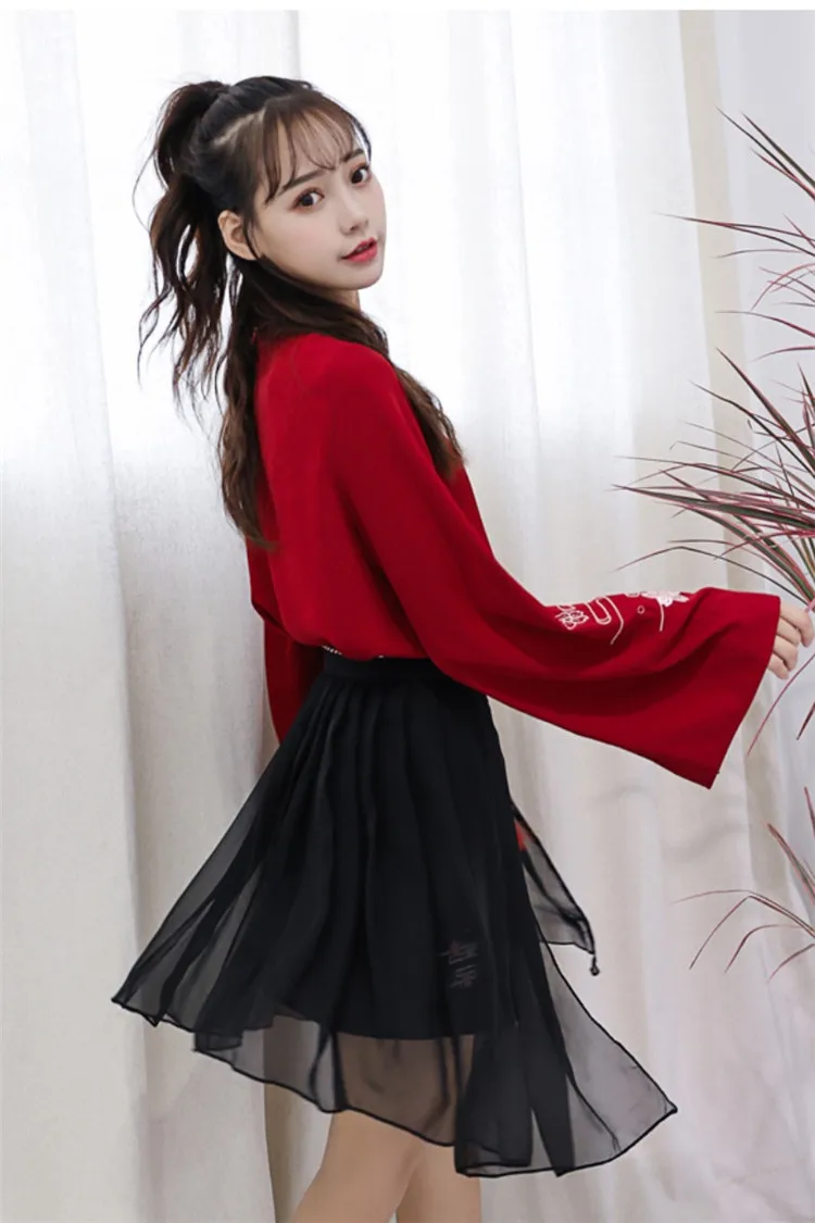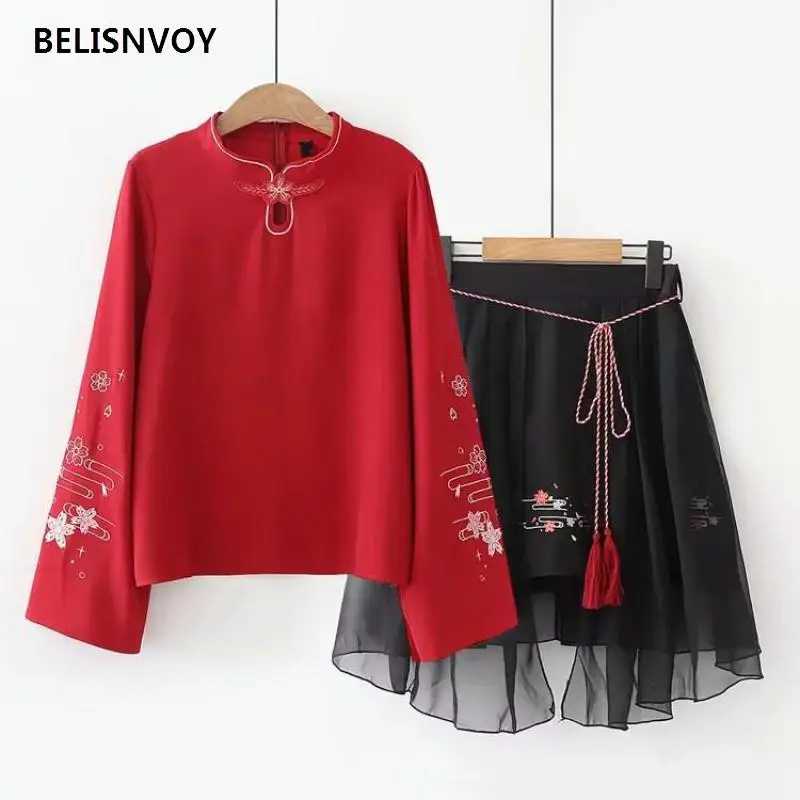 Размеры: S-xl Комплект из 2 предметов женщины в китайском стиле Стиль цветочной вышивкой, с длинными рукавами, цвета: красный, блузка и юбка в сеточку Женская одежда комплект