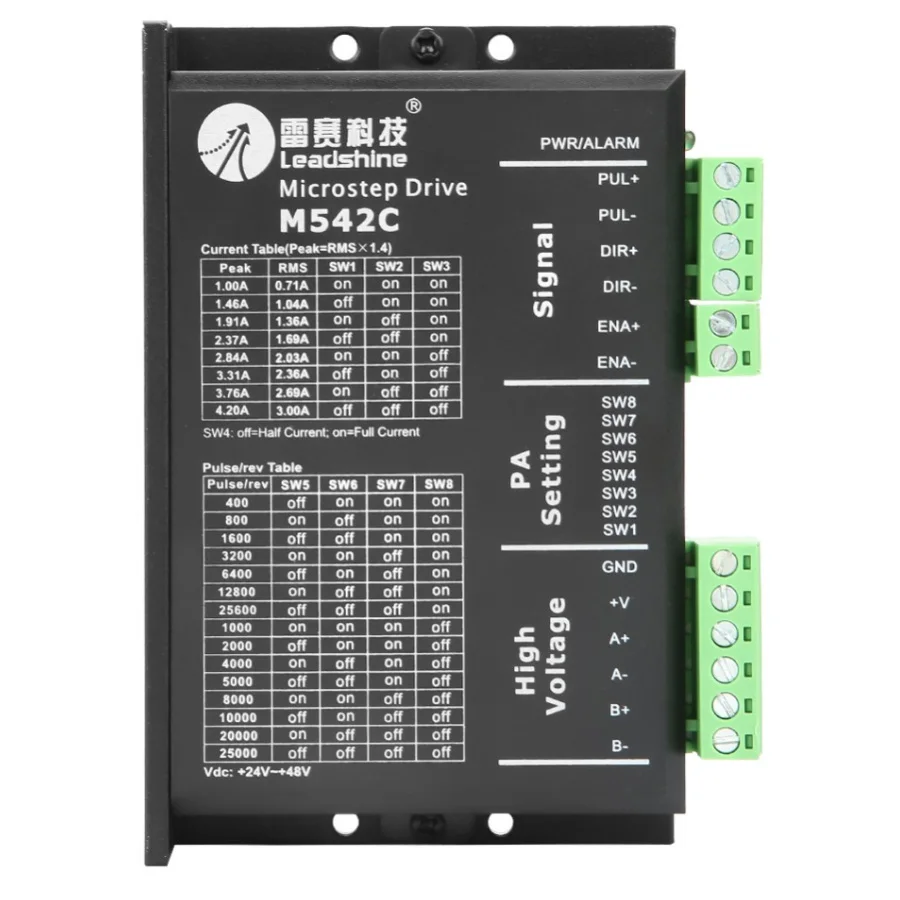 Хорошая высокоскоростная работаНапряжение источника питания до 50 В постоянного тока, выходной ток до 4,2 АМетоды саморегулировки, технология управления чистым синусоидальным токомВходная частота импульса до 300 кгц. TTL совместим с оптическим изоляционным входомПятимерное необязательное разрешение, двоичное до 25600 шагов/вращенийПодходит для 2-фазных и 4-фазных двигателейПоддержка режимов PUL/DIR и CW/CCWС защитой от короткого замыкания, перенапряжения, перегрузки по токуСпецификация:Модель: M542CНапряжение источника питания: + 50 В постоянного токаВыходной ток: 4,2 АПодходит: 2/4 фазный шаговый двигательВес: прибл. 228 г/8 унций