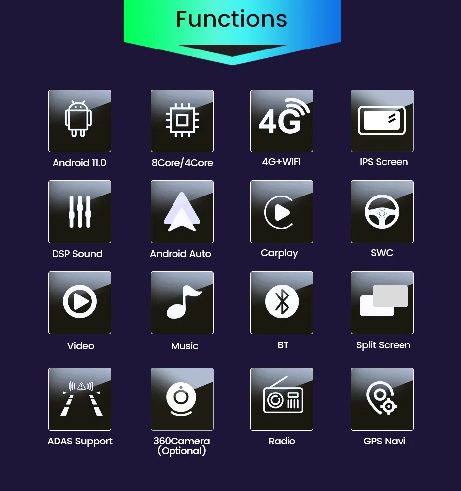 supportWIFI.OBD2 .DVR DAB+ TMPS rear view camera Bluetooth
