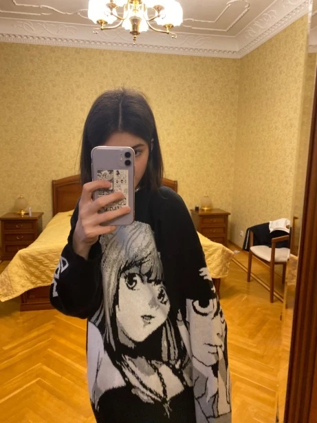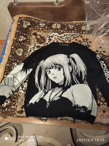 Свитер пришёл за 11(вроде как), фотографии совпадают, я надеялся что свитер тёплый но стоило его надеть уже стало жаркрвато). Для вечерних прогулок летом самое то, заказал себе XXL(100 кг и в длину 190 см) ничего не жмёт(это радует). Советую данного продавца и данный свитер поклонникам "Тетради смерти"