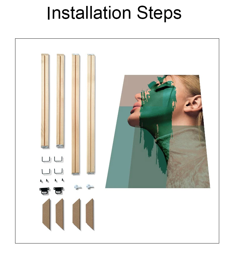 1. Картина (без этого, вам нужно подготовить) 2. Рамка 3. Картон 4. «U» гвоздь 5. Черный крючок и небольшой винт 6. Инструменты: молоток, отвертка (без этого, вам нужно подготовить)