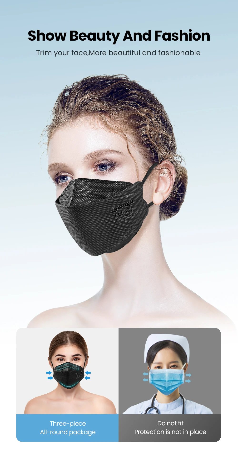 1. Регулируемая переносица2,4 слоев, более безопасный3. Эластичный ушной шнур, не душит ухо4. Проверка водонепроницаемости, Более дышащая5. Складная конструкция, легко получить