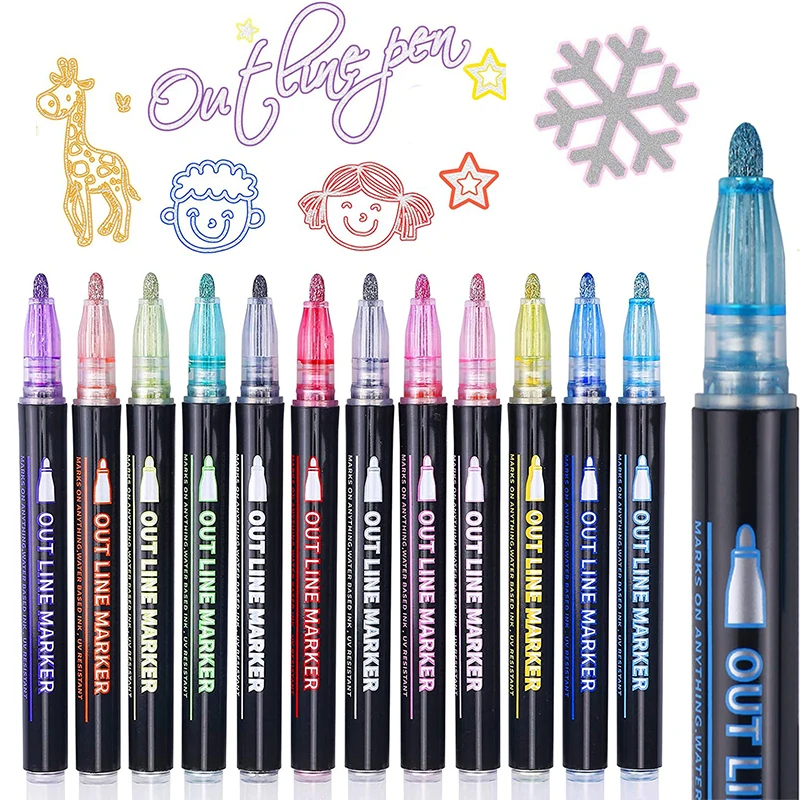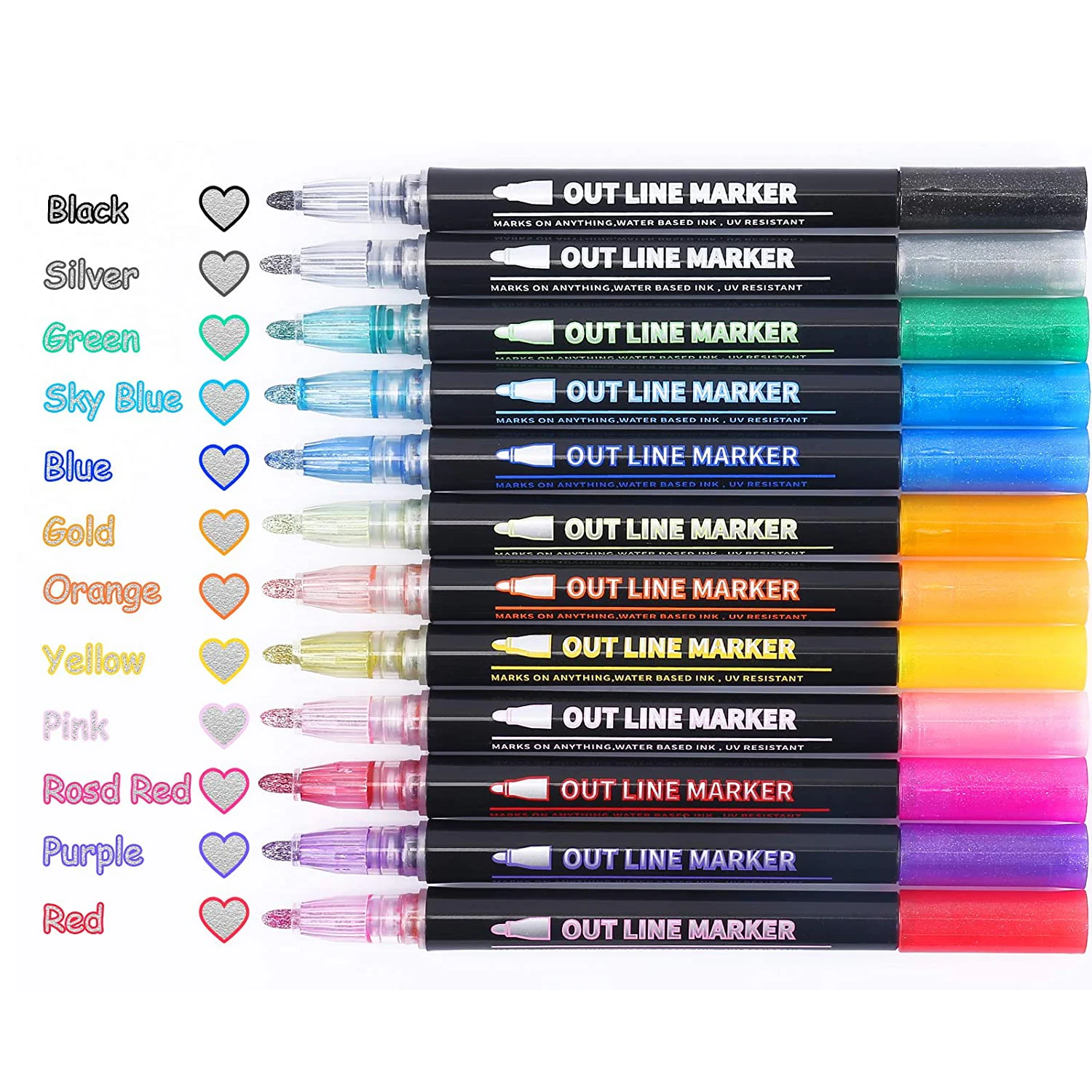 Двойная линия и блестящий эффект: 12 цветов контурных ручек, вы можете использовать эти Контурные маркеры, чтобы нарисовать 3 различных результата, когда вы пишете на светильник и белую бумагу, вы можете нарисовать две линии одновременно, серебристые и красочные. Если вы рисуете на гладкой поверхности, Он нарисует Красочные линии, но не серебро. Если вы рисуете на черной бумаге, это только показывает серебряный цвет