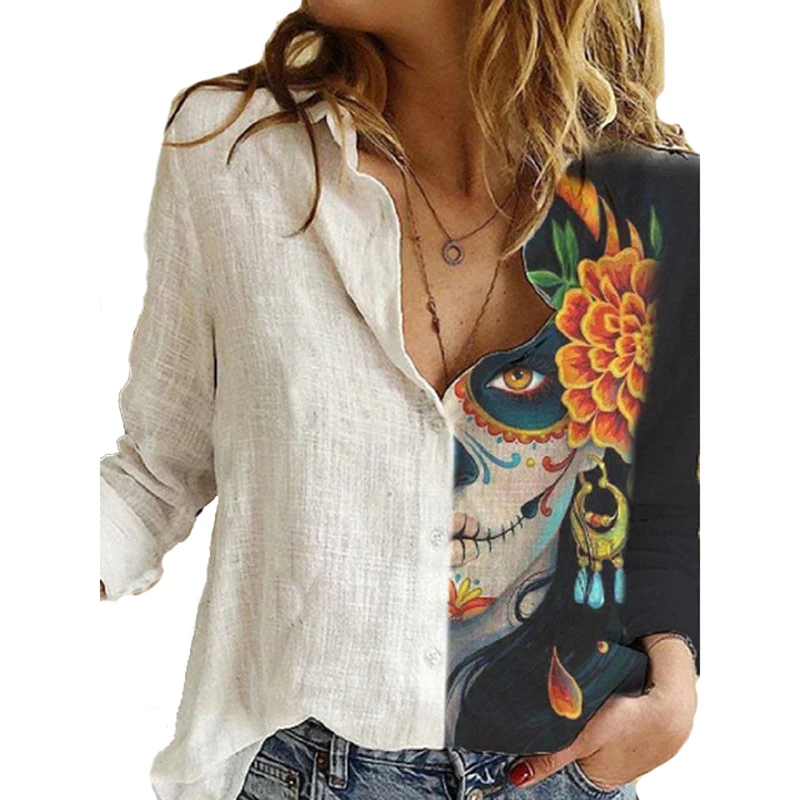 Ретро шить норковая шуба женская мода, купальный костюм с изображением мордочки с длинным рукавом Блузка 2021 Весна с лацканами, с пуговицей, на каждый день, Топ Леди 3XL хлопчатобумажные рубашки для мальчиков из полиэстера