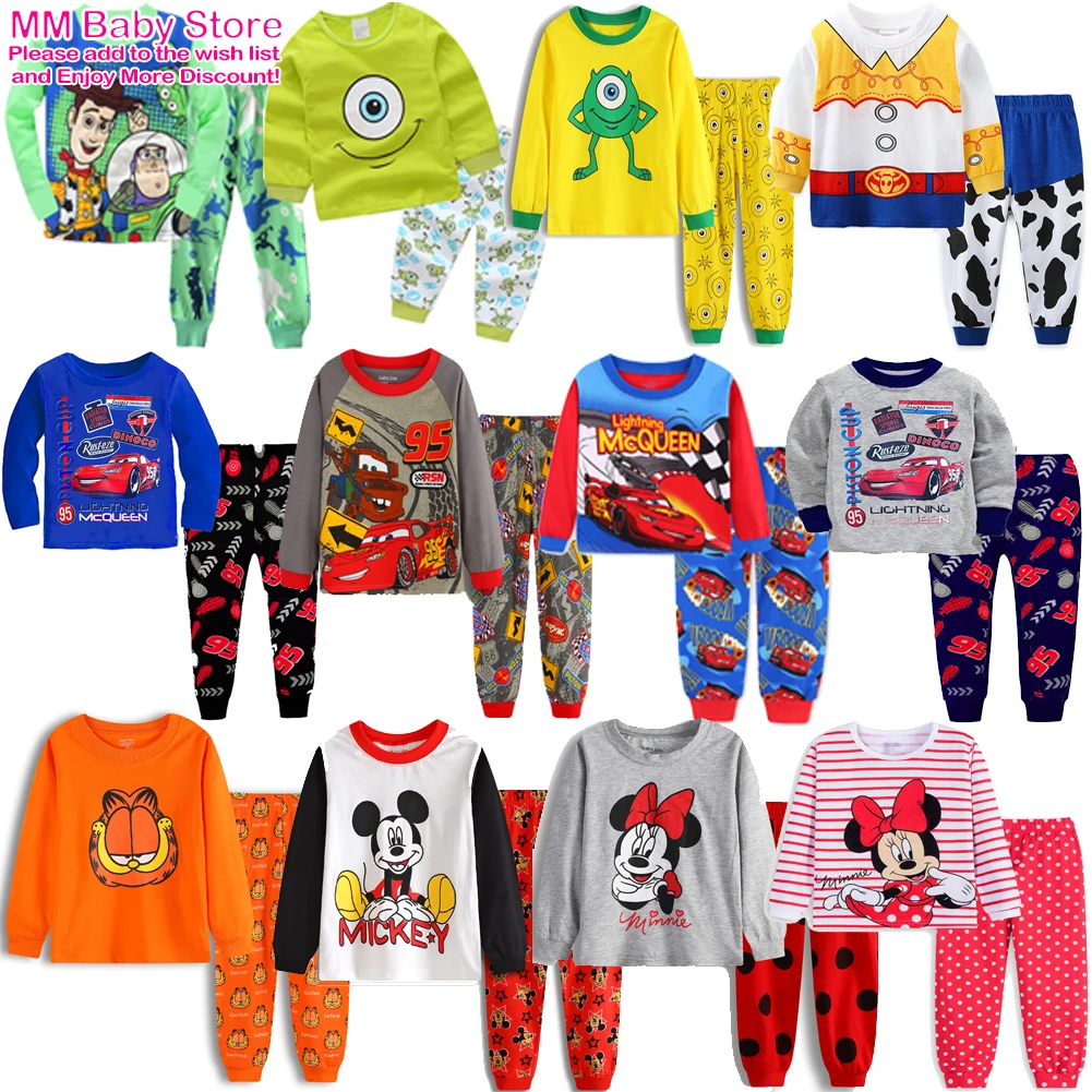 Новые весенне-осенние комплекты детской одежды для сна Одежда для мальчиков пижамы с изображением Лайтера комплект с машинками для девочек, хлопковые пижамы с рисунком Минни