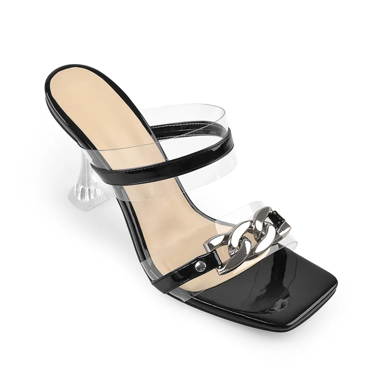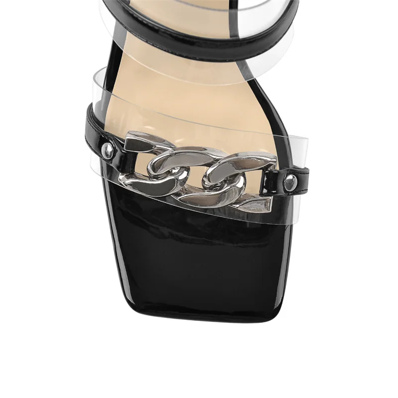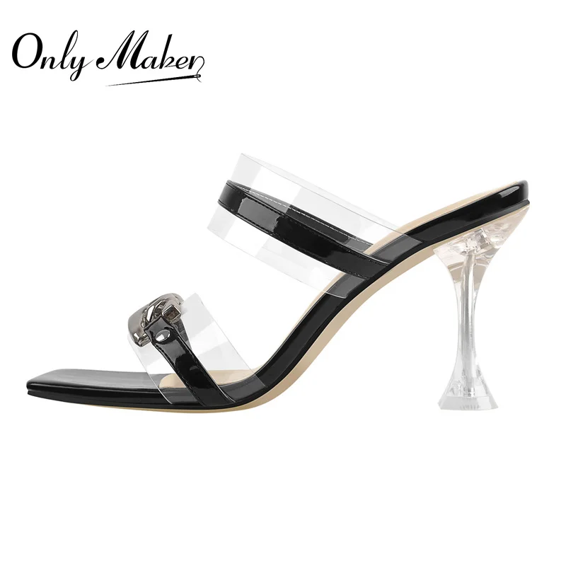 Onlymaker летние женские квадратные Босоножки с открытым носком с красивым принтом; Обувь с Лакированная кожа прозрачные босоножки на высоком каблуке, украшенные металлическими деталями и декоративная металлическая цепь тапочки на каждый день