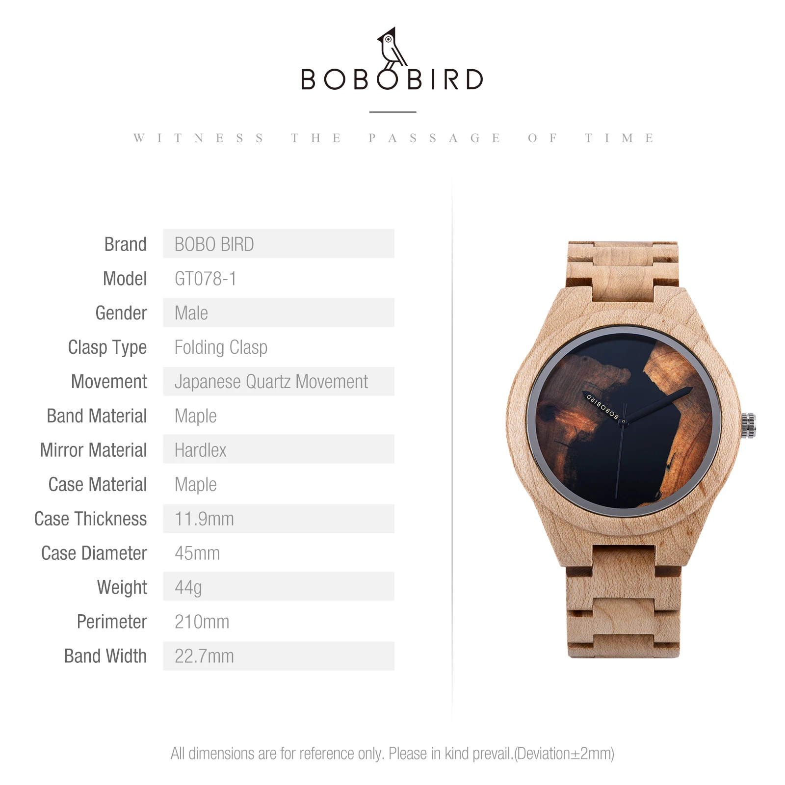 Бренд: BOBO BIRDМодель: GT078Пол: Для МужчинСтиль: Роскошная МодаЦвет: желтый, черный, синий, белыйМеханизм: японский кварцевый механизмВес: 51 гПериметр: 225 ммМатериал корпуса: чакат-Прето + Зебра дерево/кожа и силиконВодонепроницаемый для повседневной жизни