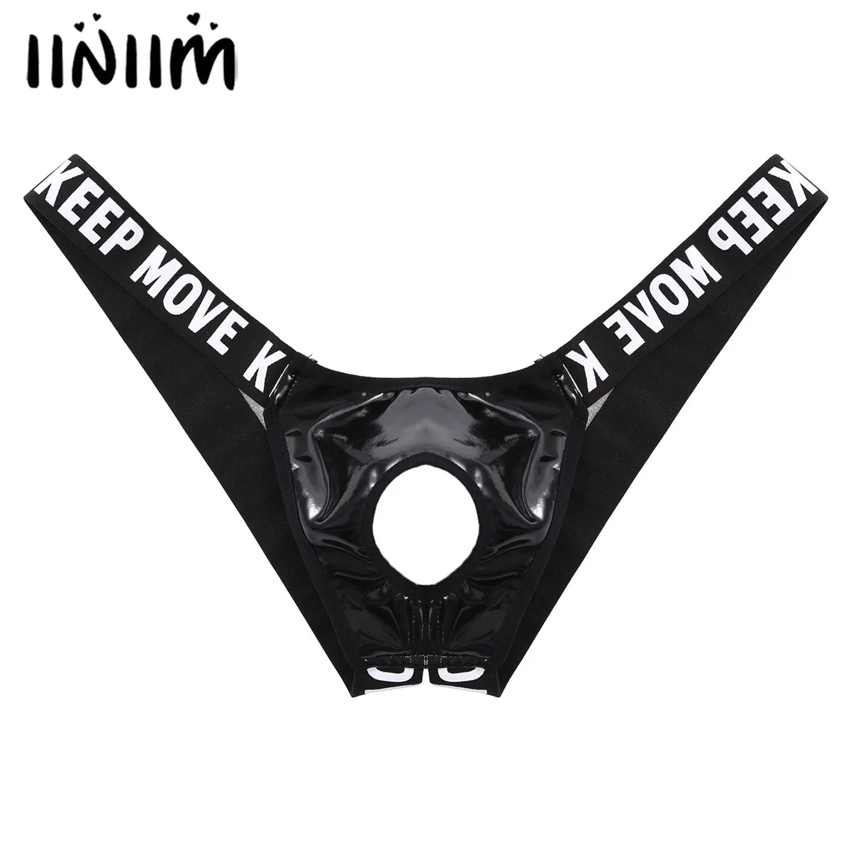 Мужские кожаные шорты с вырезами из лакированной кожи, с мешочком, с Т-образным ремешком, с буквенным принтом, пояс, стринги, нижнее белье