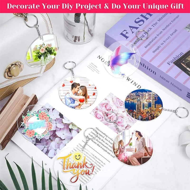 Посылка включает в себя: 100 шт прозрачный акриловый брелок для ключей, поверхность имеет защитную пленку, которая позволяет вашему акриловому диску достичь царапин.