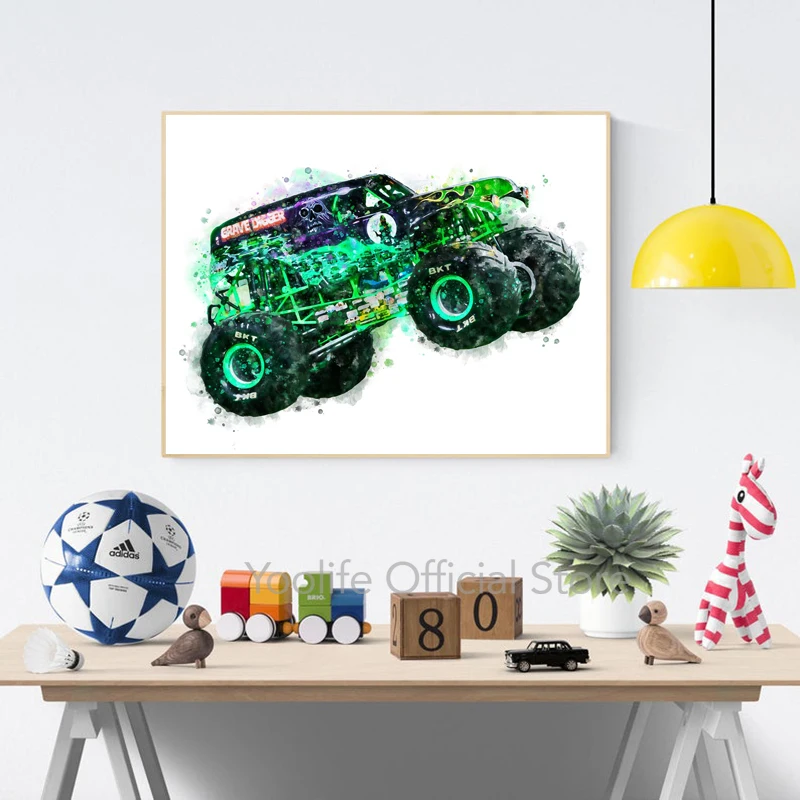 Картина монстр-Трак, акварельная живопись, могила, экскаватор, холст, принты для детской комнаты, для мальчиков, для украшения стен, подарок на день рождения для мальчика