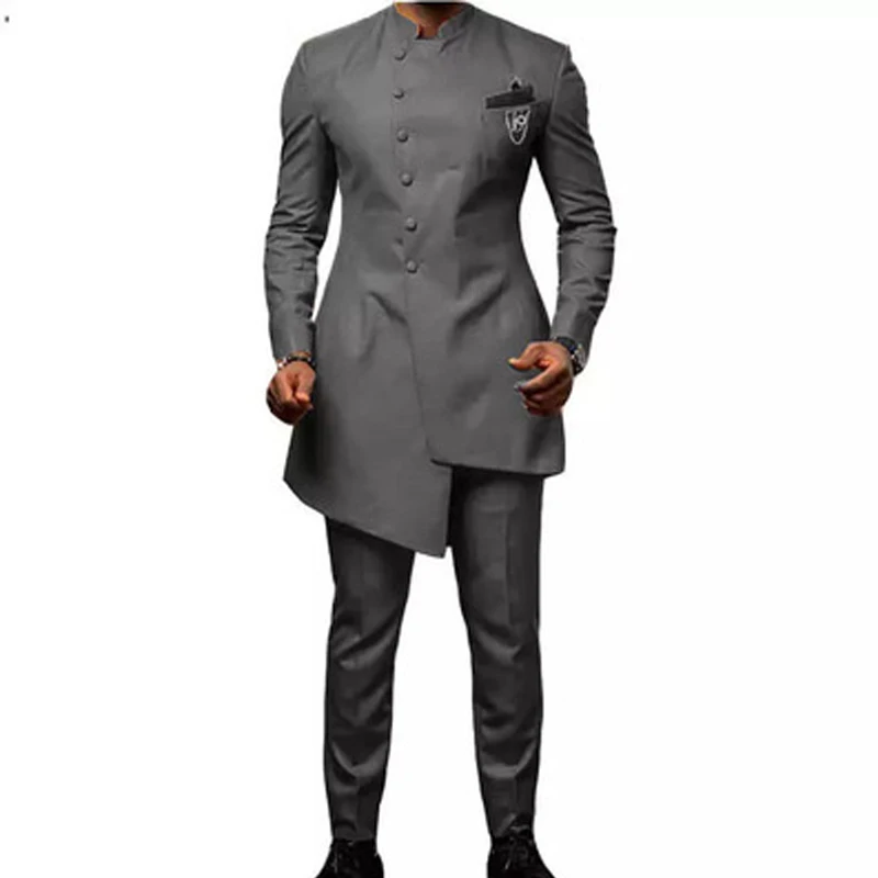 Костюм в африканском стиле для мужчин, асимметричный облегающий деловой повседневный костюм с воротником-стойкой, костюм для жениха, лучшего человека, свадьбы (Блейзер + брюки), 2 шт.