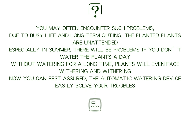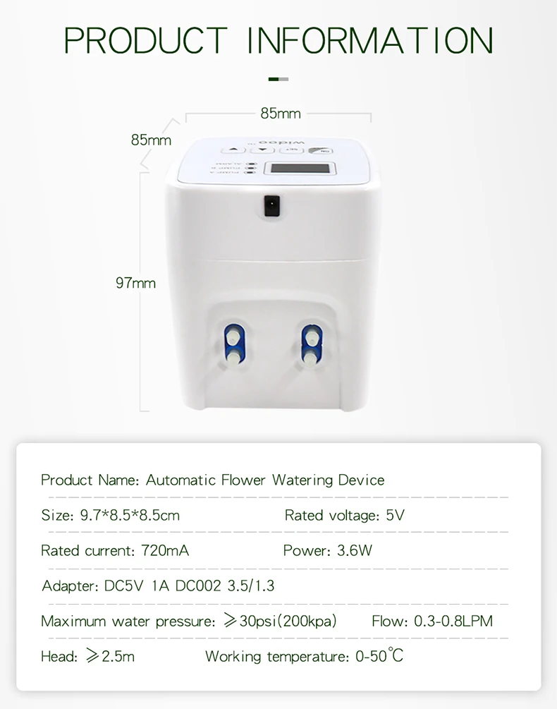 Особенности> Интеллектуальный полив по времени. Для выбора доступны точные временные параметры и автоматически регулярно Поливайте растения.> Нет необходимости подключать кран. Бесплатный выбор контейнера для хранения воды, никаких ограничений на смеситель.> Два способа источника питания. Вы можете выбрать 4 батарейки AA или адаптер в качестве источника питания.Параметры синхронизацииВремя полива: 0 ~ 999 с опциональноВремя интервала: 0 ~ 999 ч опциональноПараметры продукта> Название продукта: Автоматическое устройство для полива цветов> Размер: 9,7*8,5*8,5 см> Номинальное напряжение: 5 В> Номинальный ток: 720 мА> Мощность: 3,6 Вт> Адаптер: DC5V 1A DC002 3,5/1,3> Максимальное давление воды: ≥ 30 фунтов на кв. дюйм (200 кПа)> Расход: 0,3-0.8л/мин> Напор: ≥ 2,5 м> Рабочая температура: 0-50 ℃