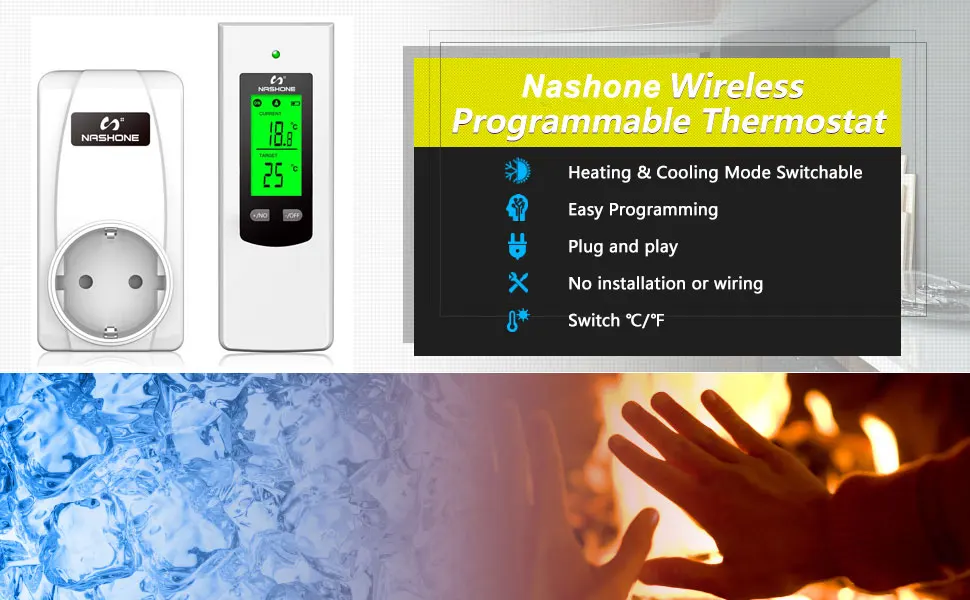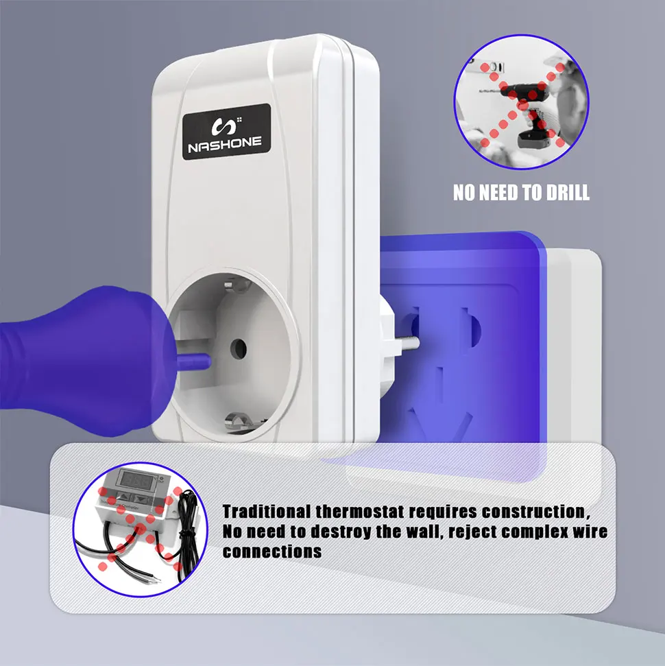 Розетка термостата nasone всегда стремится сделать жизнь умнее, проще и удобнее. Этот термостат поможет сделать ваш дом не только комфортным, но и энергоэффективным. Термостат может экономить энергию на нагреве или охлаждении, регулируя температуру.Этот программируемый Штепсель-термостат nasone поставляется с пультом дистанционного управления и отображает целевую температуру и температуру тока. Он используется для автоматического управления блоками отопления или охлаждения. Когда текущая температура достигает целевой температуры, она автоматически включит/выключит нагревательный элемент или охлаждающий блок. Сохранение стабильной комнатной температуры и экономии энергии.