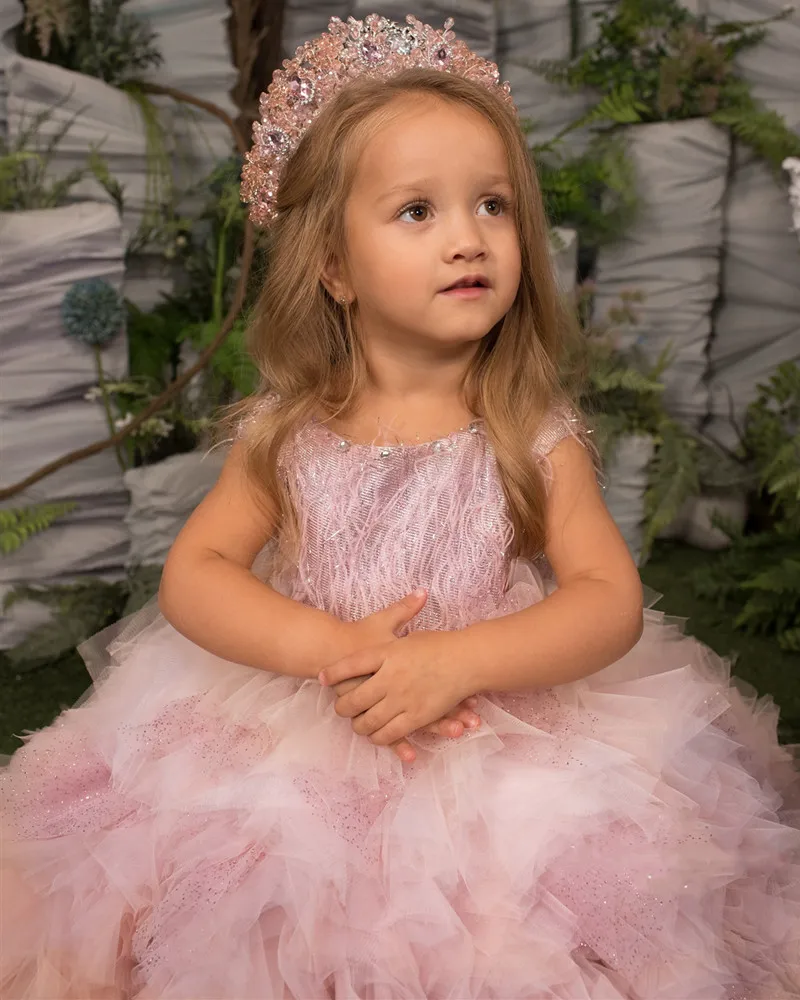 Тюлевые платья для девочек, белые, с перьями и цветами, пышные плат...