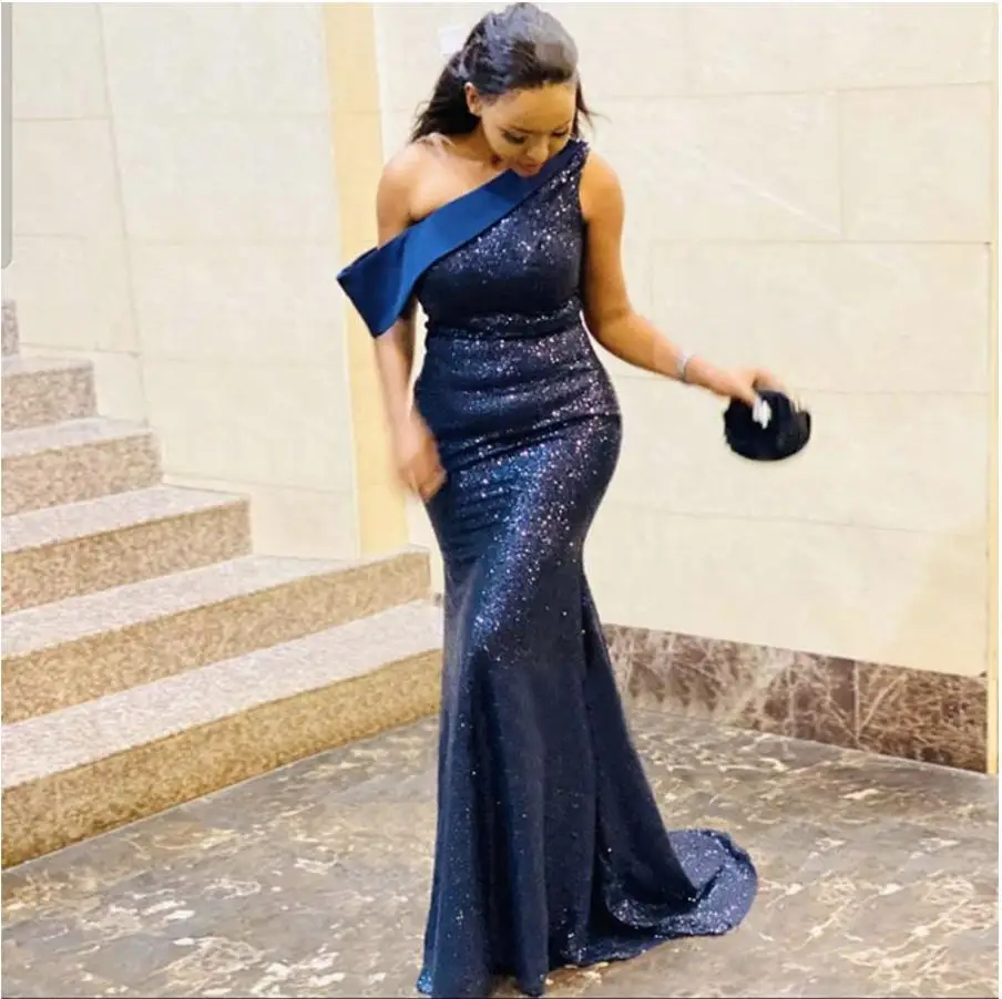 Темно-синий Русалка платья подружек невесты; Длинное платье на одно плечо с блестками лучшее для женщин Свадебная вечеринка платье для девочек фрейлина