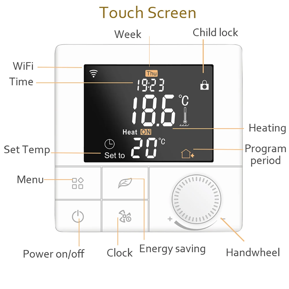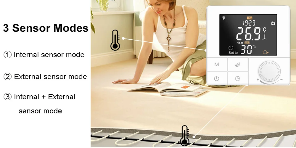 1. Продукт «без wifi» не имеет функции Wi-Fi, он не может управляться телефоном.2. Термостат с электрическим подогревом пола включает внешний датчик, термостат с водяным подогревом пола не включает внешний датчик!