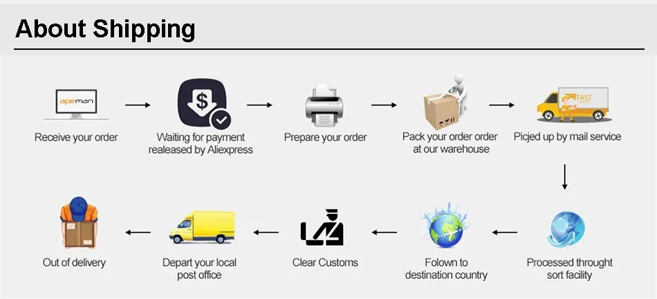 1. Когда вы размещаете заказ, пожалуйста, выберите способ доставки для заказа, для бесплатной доставки, мы отправим AliExpress стандартную доставку. Пожалуйста оплатите ваш заказ как можно раньше.2. Пожалуйста, подтвердите правильный адрес. Мы не несем ответственности за неправильный или недопустимый адрес доставки.3. Мы отправим продукцию в течение 1-5 рабочих дней после оплаты, для OEM продукта, мы отправим вам в течение 7 рабочих дней.4. Для более высоких ценовых заказов рекомендуется выбирать Международный Экспресс-экспресс, такой как DHL, UPS, FEDEX, TNT или EMS.